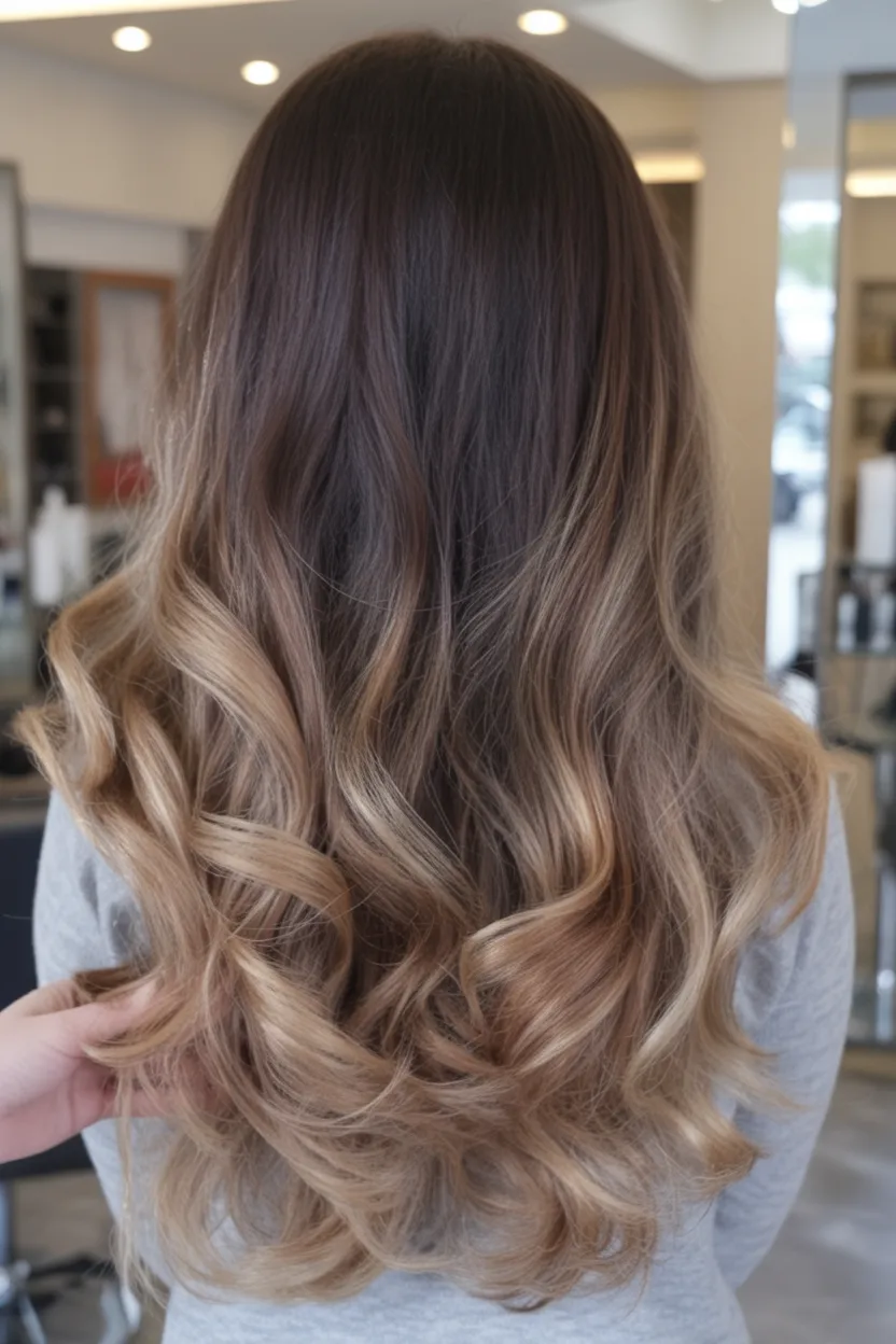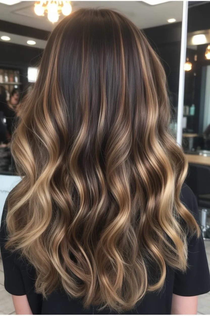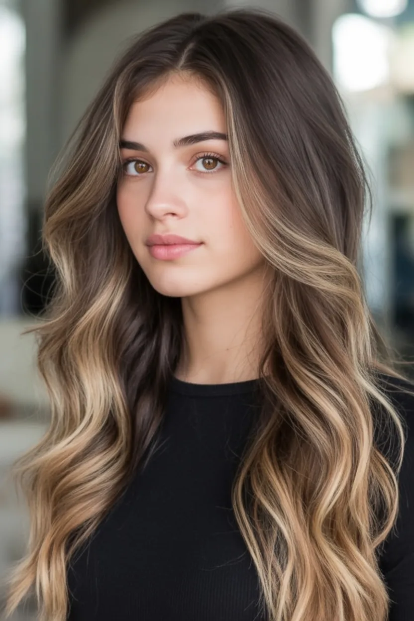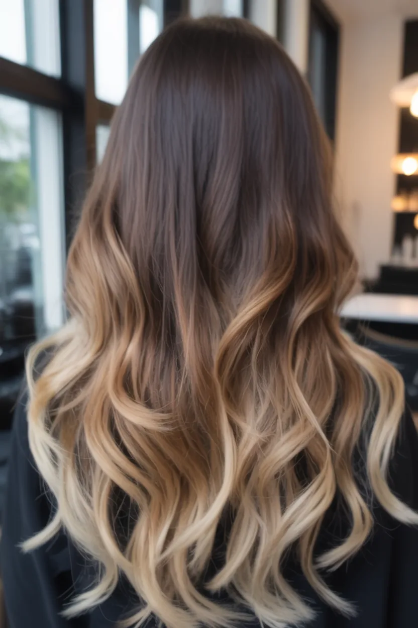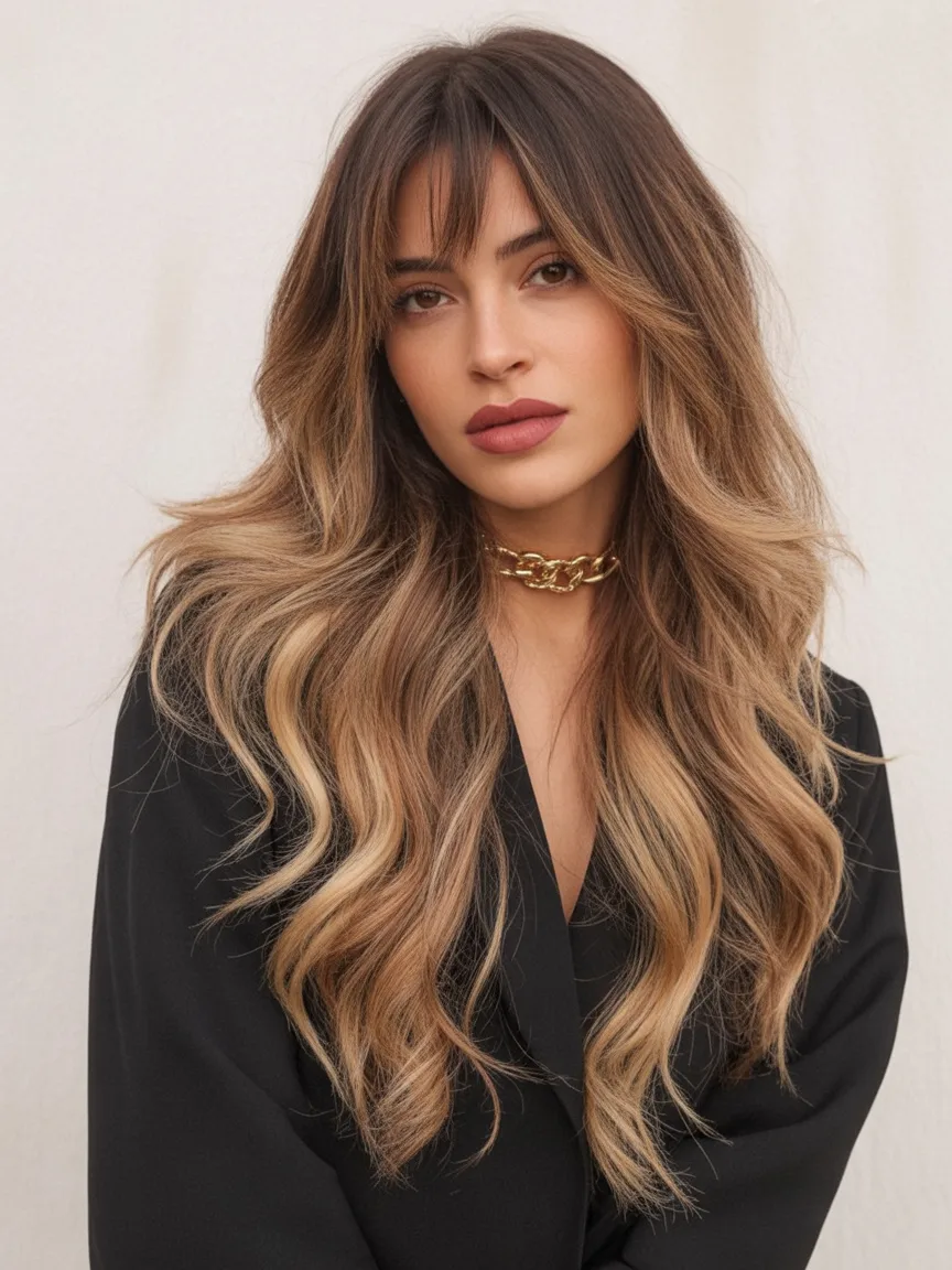 This Long balayage has that effortless glow we all secretly want. The Dark brown base melts into natural Blonde highlights that look kissed by the sun rather than painted on. The waves are loose and touchable, giving the entire style a romantic, lived-in feel that’s both flattering and timeless.