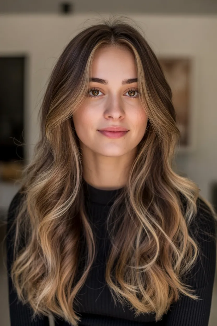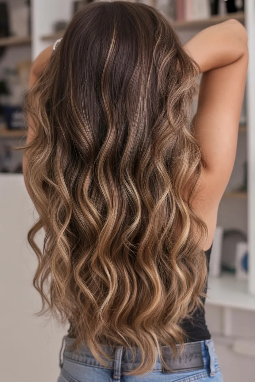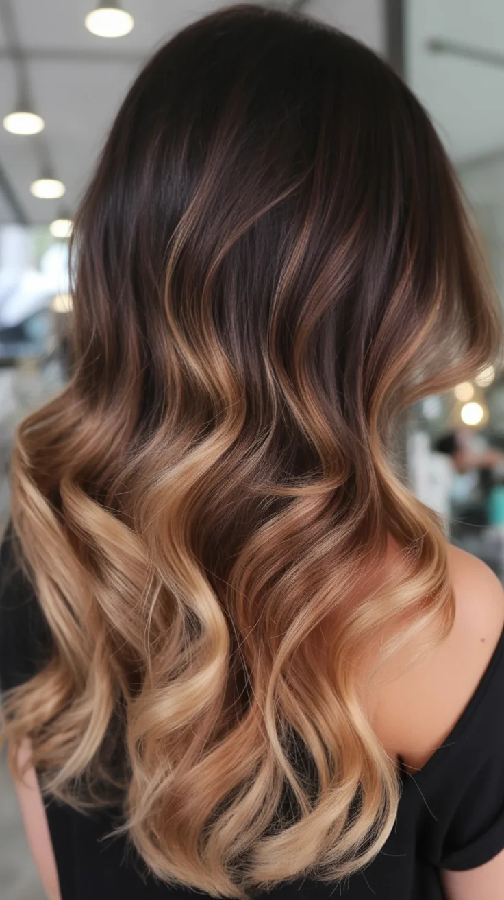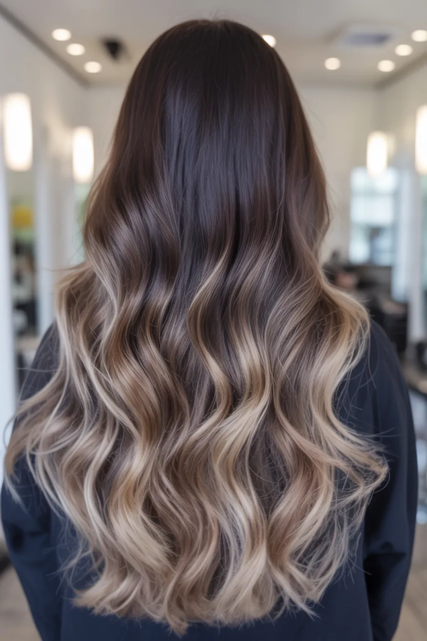 This Long balayage has that effortless glow we all secretly want. The Dark brown base melts into natural Blonde highlights that look kissed by the sun rather than painted on. The waves are loose and touchable, giving the entire style a romantic, lived-in feel that’s both flattering and timeless.