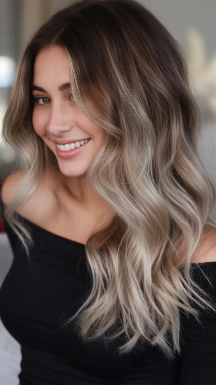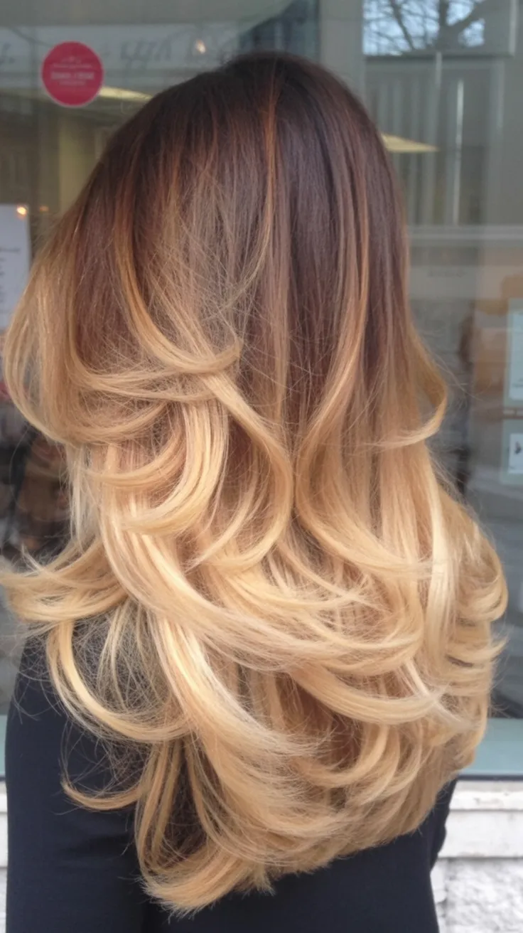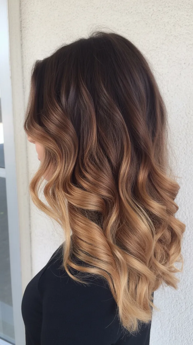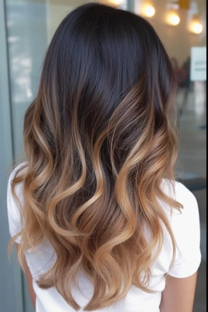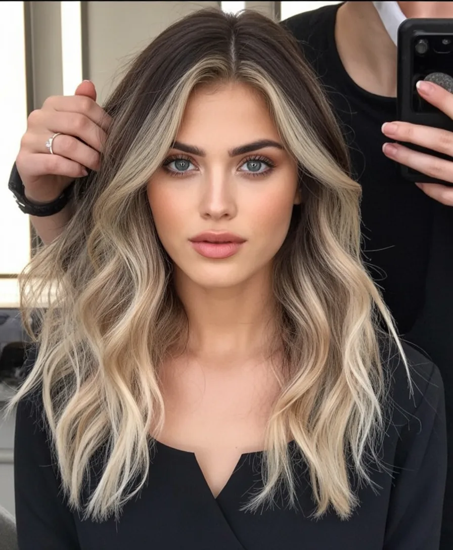 This Long balayage has that effortless glow we all secretly want. The Dark brown base melts into natural Blonde highlights that look kissed by the sun rather than painted on. The waves are loose and touchable, giving the entire style a romantic, lived-in feel that’s both flattering and timeless.
