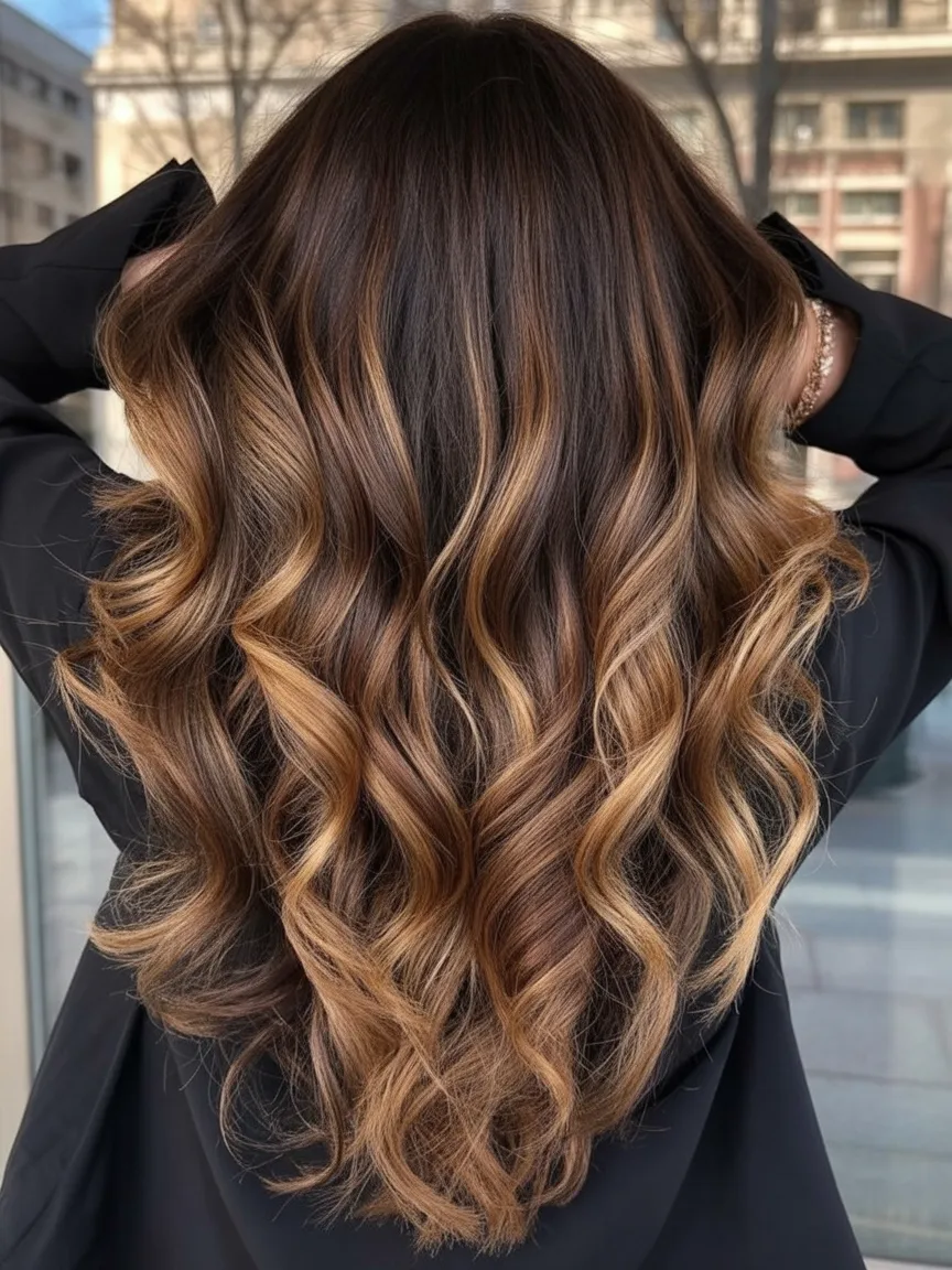 This Chocolate brown base is deep and luxurious, and when it melts into Golden Honey tones at the ends, it’s pure magic. The waves create that soft ripple effect that makes the Color look even richer. It’s warm, inviting, and just a little glamorous—the kind of hair that makes you feel instantly put together.