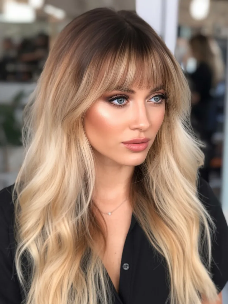 Now this one has personality. The Long layers paired with soft, wispy bangs create that romantic, slightly playful energy that feels very now. The Blonde and brown blend brightens the entire look, while the airy fringe frames the eyes beautifully. It’s feminine, flattering, and just bold enough to feel like a real change.