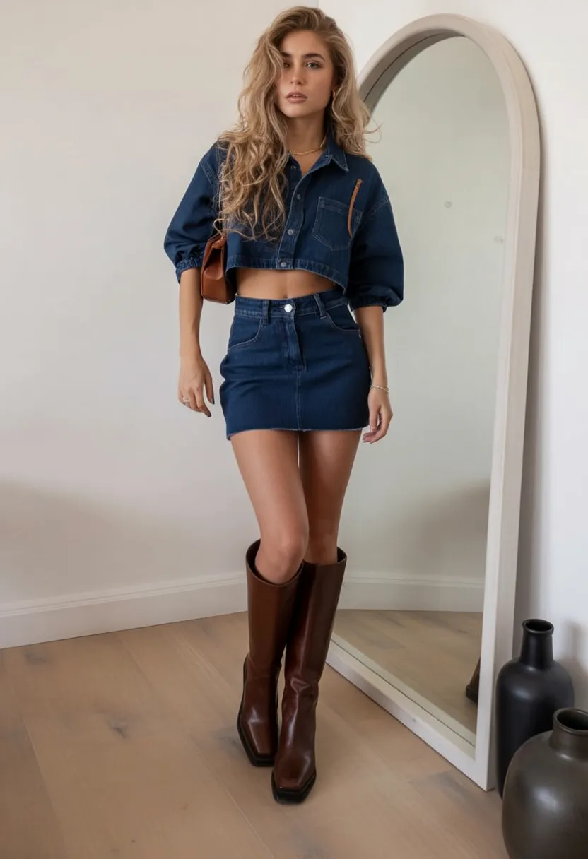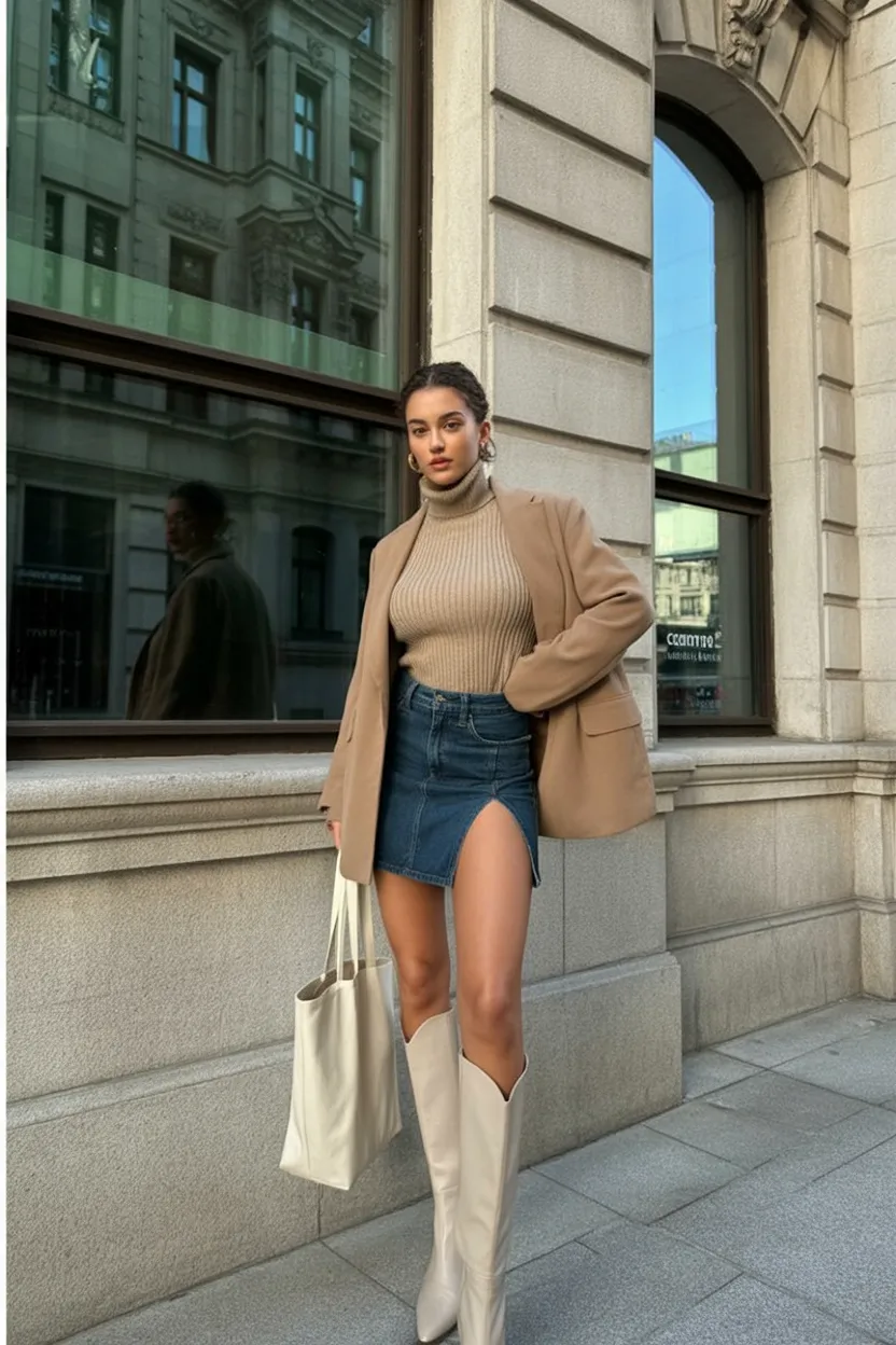 This outfit balances structure and ease in a way that feels confident and modern. The structured blazer adds sharpness, while the denim skirt keeps the look approachable and wearable. It’s an ideal combination for women who enjoy modest fashion with a contemporary edge.