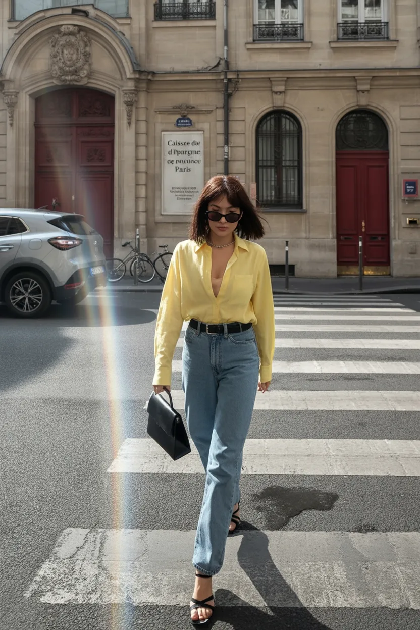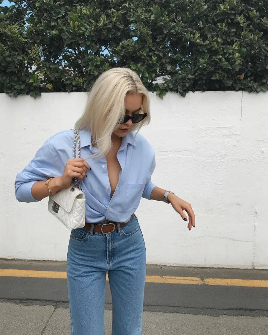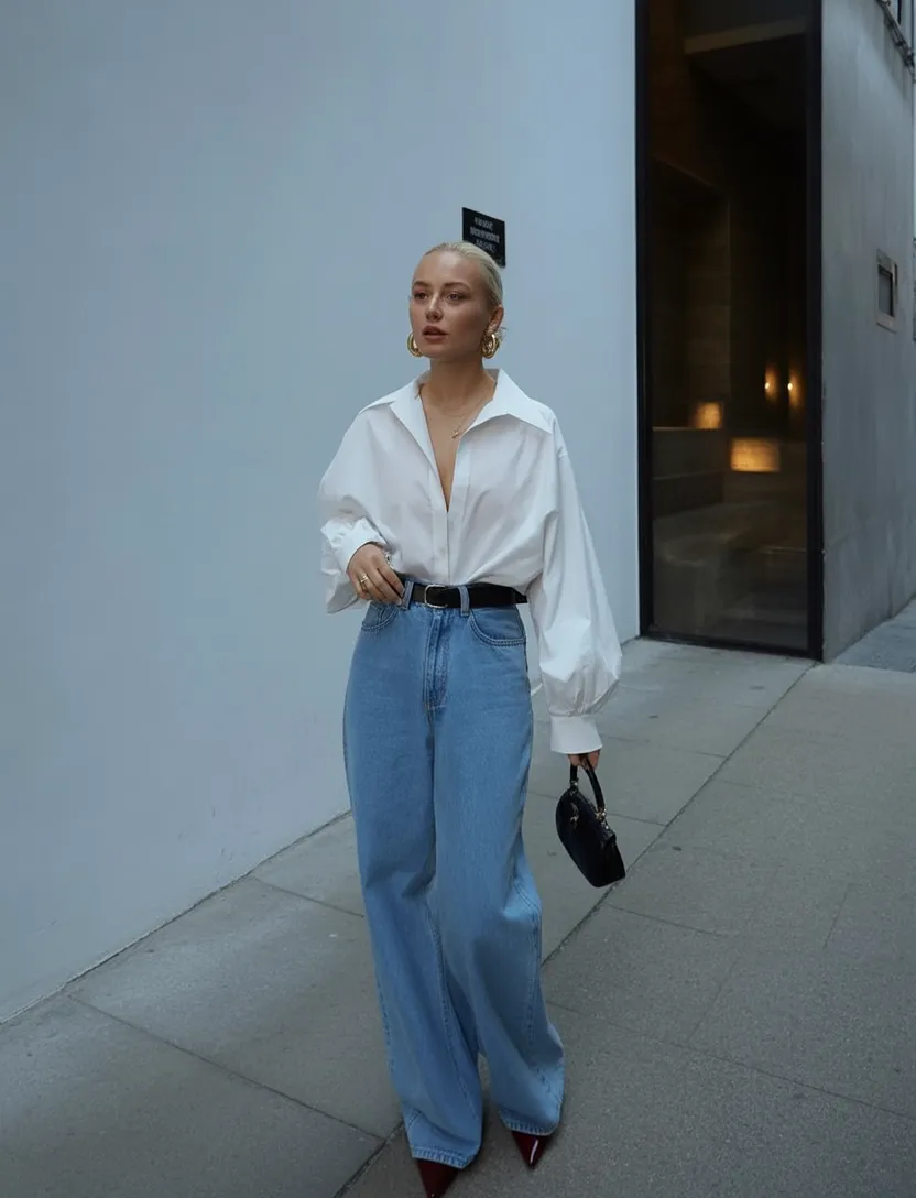 This outfit feels calm, fresh, and grounded. The light blue shirt softens the structure of wide-leg jeans, creating a silhouette that feels balanced and comfortable. It’s ideal for spring days when ease and breathability matter most.
