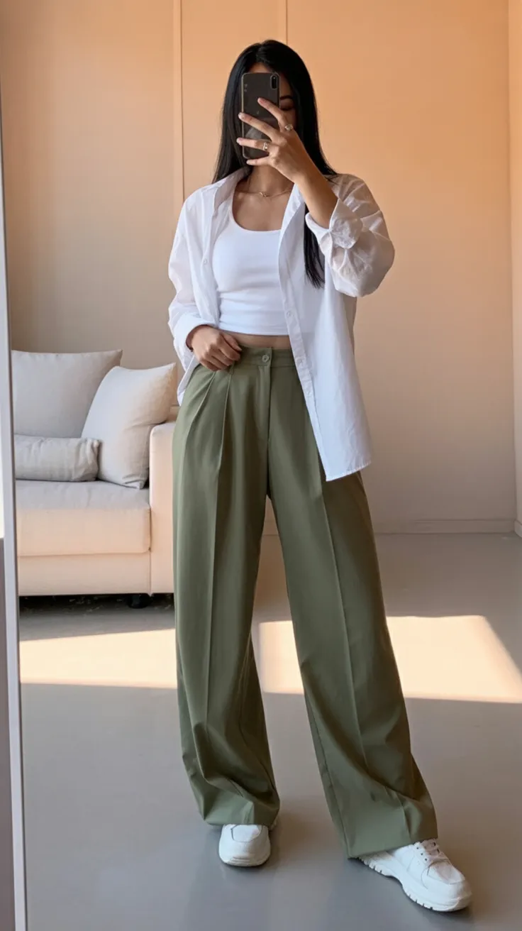 This outfit offers balance through clean lines and earthy tones. The white shirt keeps things crisp, while olive pants add warmth and depth. It’s practical, flattering, and easy to repeat.