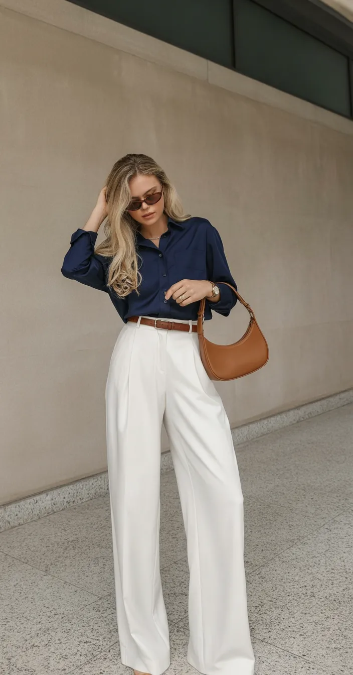 This look captures relaxed everyday energy. The blue shirt keeps it casual, while white pants feel fresh.