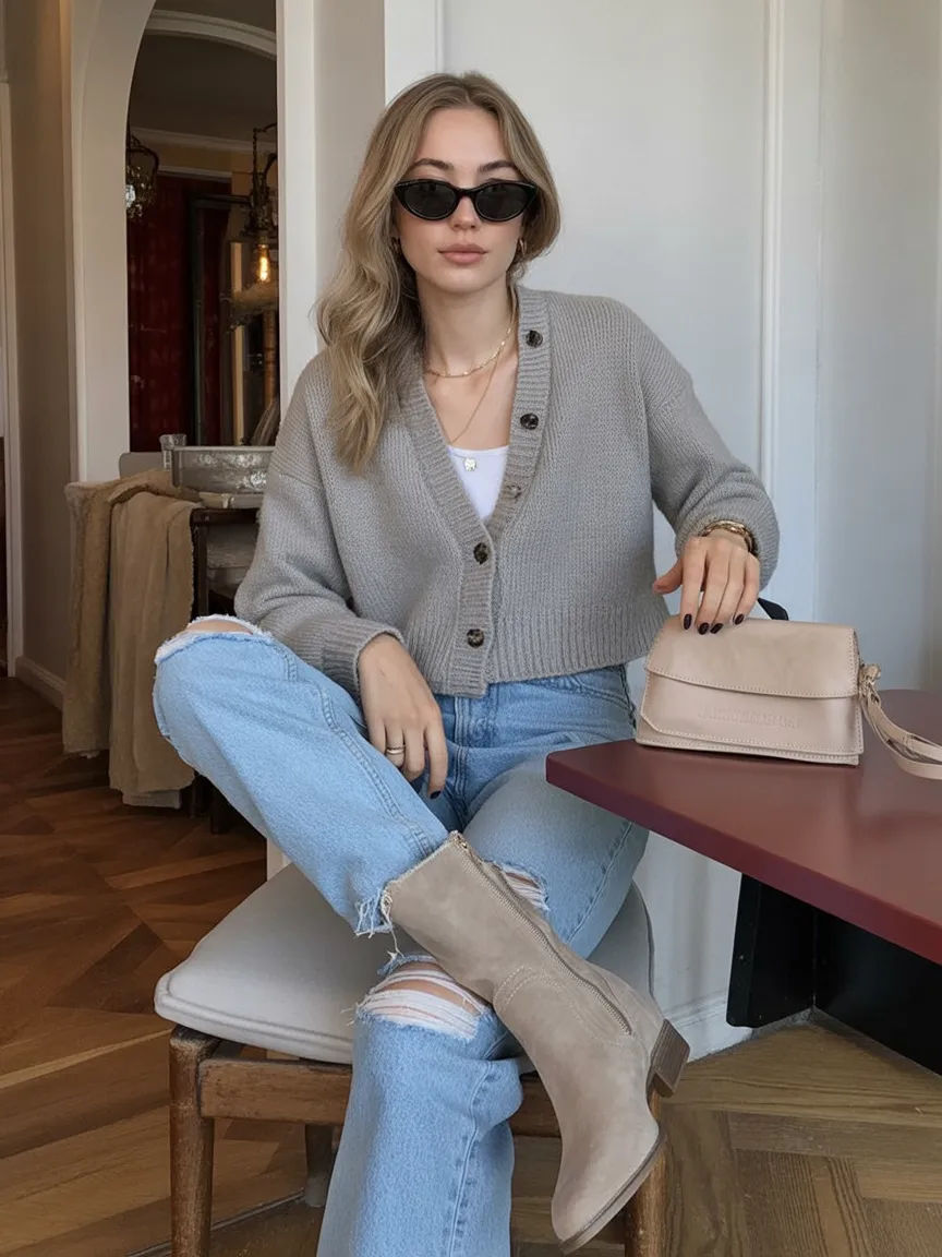 This outfit feels warm and relaxed, perfect for unpredictable spring weather. The cardigan adds softness, while light denim keeps it practical.