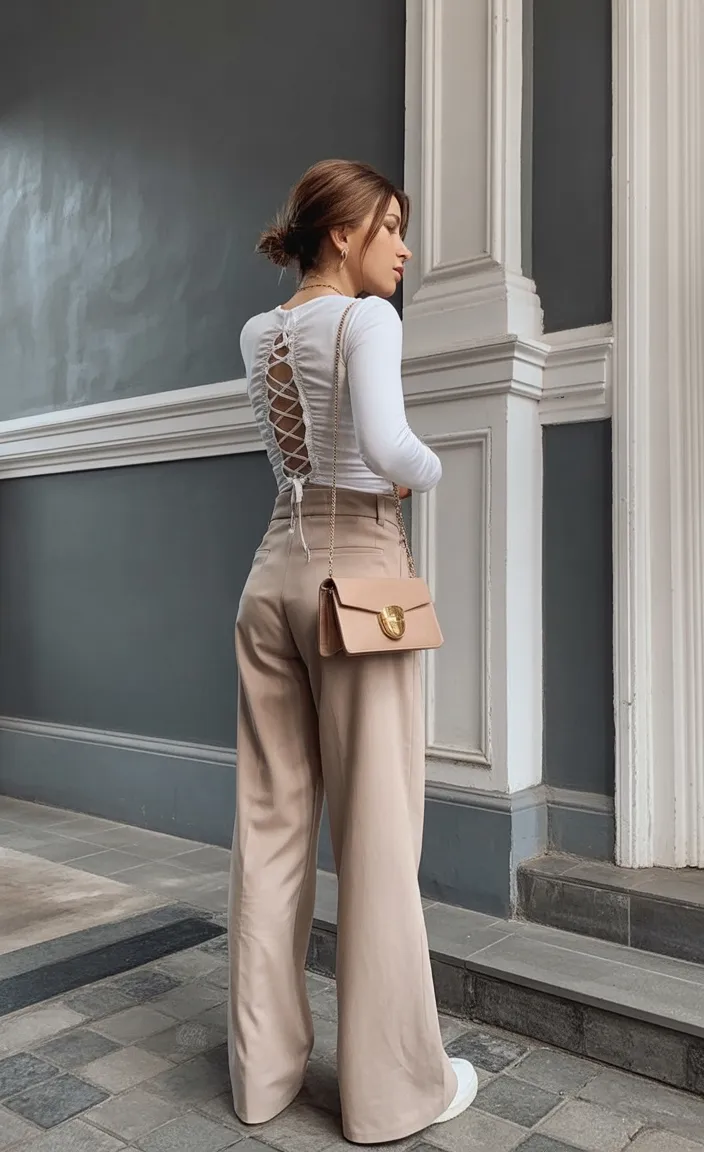 This outfit feels refined and thoughtful. Neutral pants create a timeless base, while the statement top adds interest without excess.