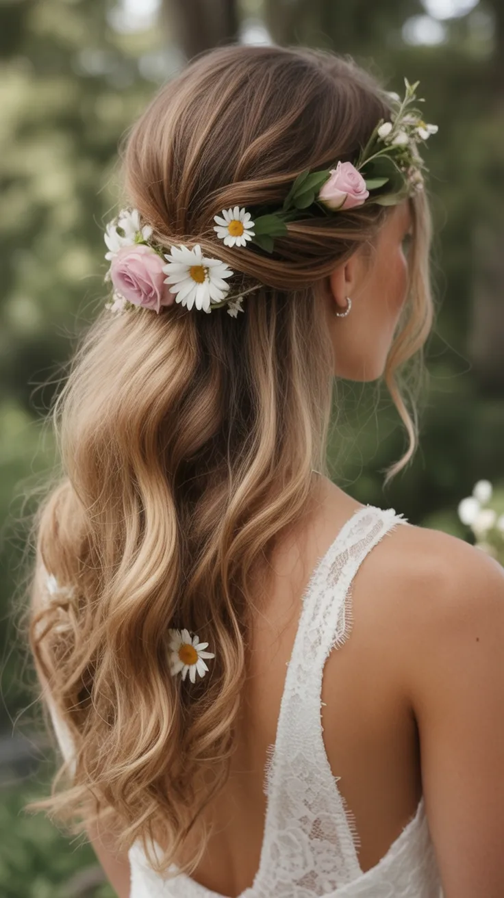 11. Floral Half-Up Style with Natural Waves