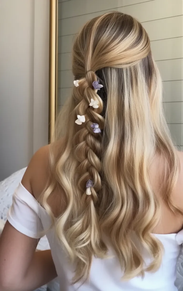 This hairstyle feels like spring captured in a single look. The half-up braid creates a beautiful focal point, while the soft waves flowing underneath keep everything romantic and airy. The delicate floral accents add a dreamy, almost storybook quality that feels especially fitting for Easter celebrations.