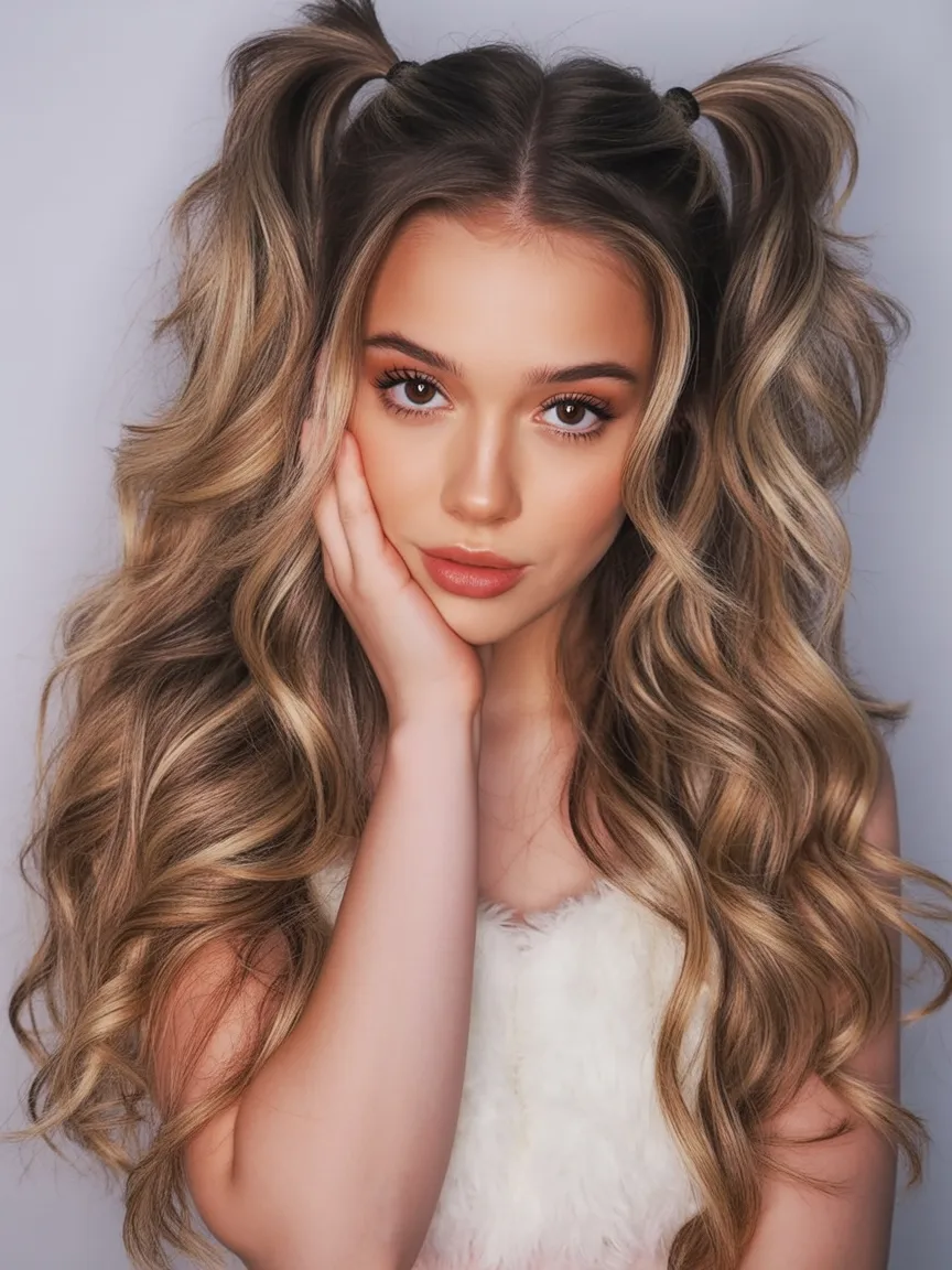 This hairstyle brings a playful energy that feels surprisingly chic. The double ponytails add a Fun twist, while the soft curls keep everything balanced and flattering. It’s youthful in spirit but styled in a way that still feels polished and intentional.