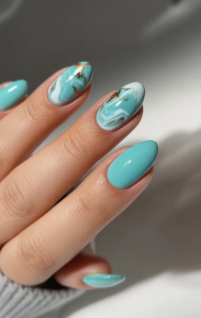 This manicure feels like jewelry for your hands. The rich turquoise color paired with swirling marble art and touches of gold design has that elevated, almost spa-luxury energy. It’s bold, yes—but in a refined way. The almond silhouette keeps it sleek and sophisticated instead of overwhelming.