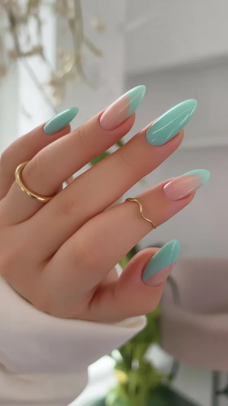 There’s something instantly uplifting about this soft mint and blush combo. The delicate French tip in a fresh aqua color feels like a modern twist on classic pink and white, but lighter, breezier—like the first warm day of spring when you finally put away your dark coats. The almond shape adds that graceful, feminine touch without feeling overdone. It’s subtle, but it definitely doesn’t go unnoticed.