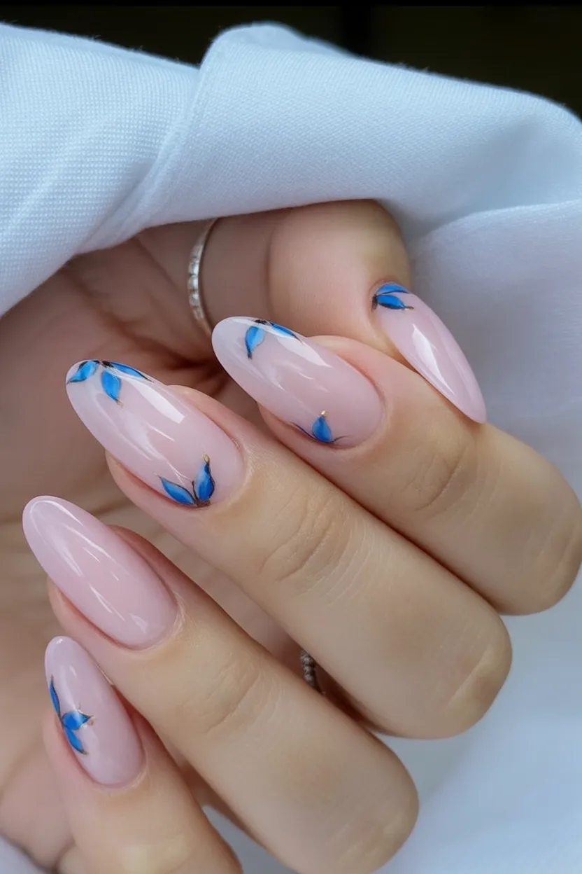 The blush almond manicure is instantly elegant. The pale pink base has that clean bubble bath energy, while the delicate blue leaf art adds just enough contrast to make it interesting. It’s romantic but not too sweet—refined with a subtle twist. Art placement is what makes this design unique. Rather than leaving all the nails fully Art-ed, the leaves are scattered around the nail tips, giving the design a sense of movement. It’s a lovely choice for almond or even coffin shapes, especially for those wanting something feminine yet contemporary for 2026.