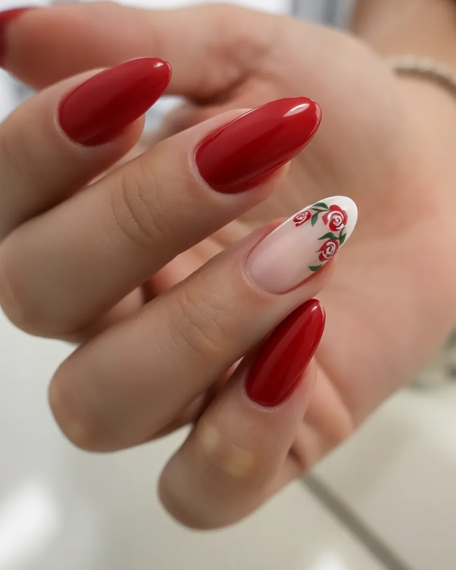 This look is perfect for almond shapes and medium to long lengths. The mix of solid color and patterned art keeps it balanced and wearable for everyday life. If you’re someone who usually sticks to simple red, adding just one accent nail like this is a fun way to experiment without stepping too far outside your comfort zone.