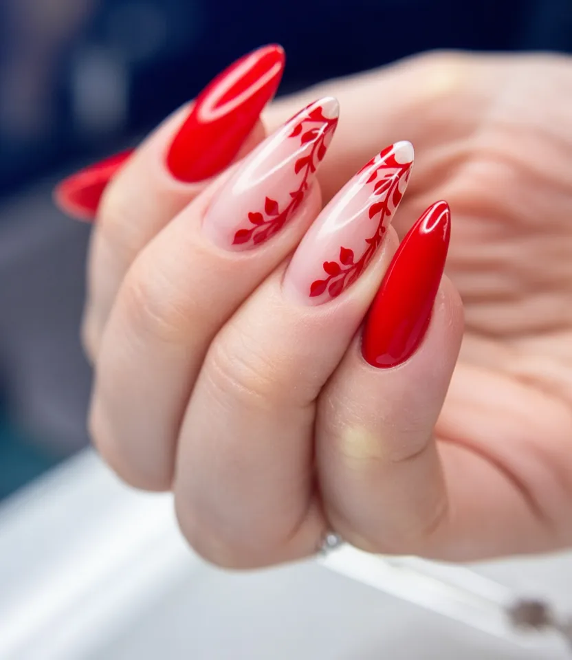 This design whispers elegance rather than shouting it. The glossy bright red nails are paired with sheer nude accents featuring delicate vine-inspired designs in matching red. It feels refined, slightly artistic, and incredibly wearable. Think of it as the minimalist’s take on nail art—subtle but still expressive.