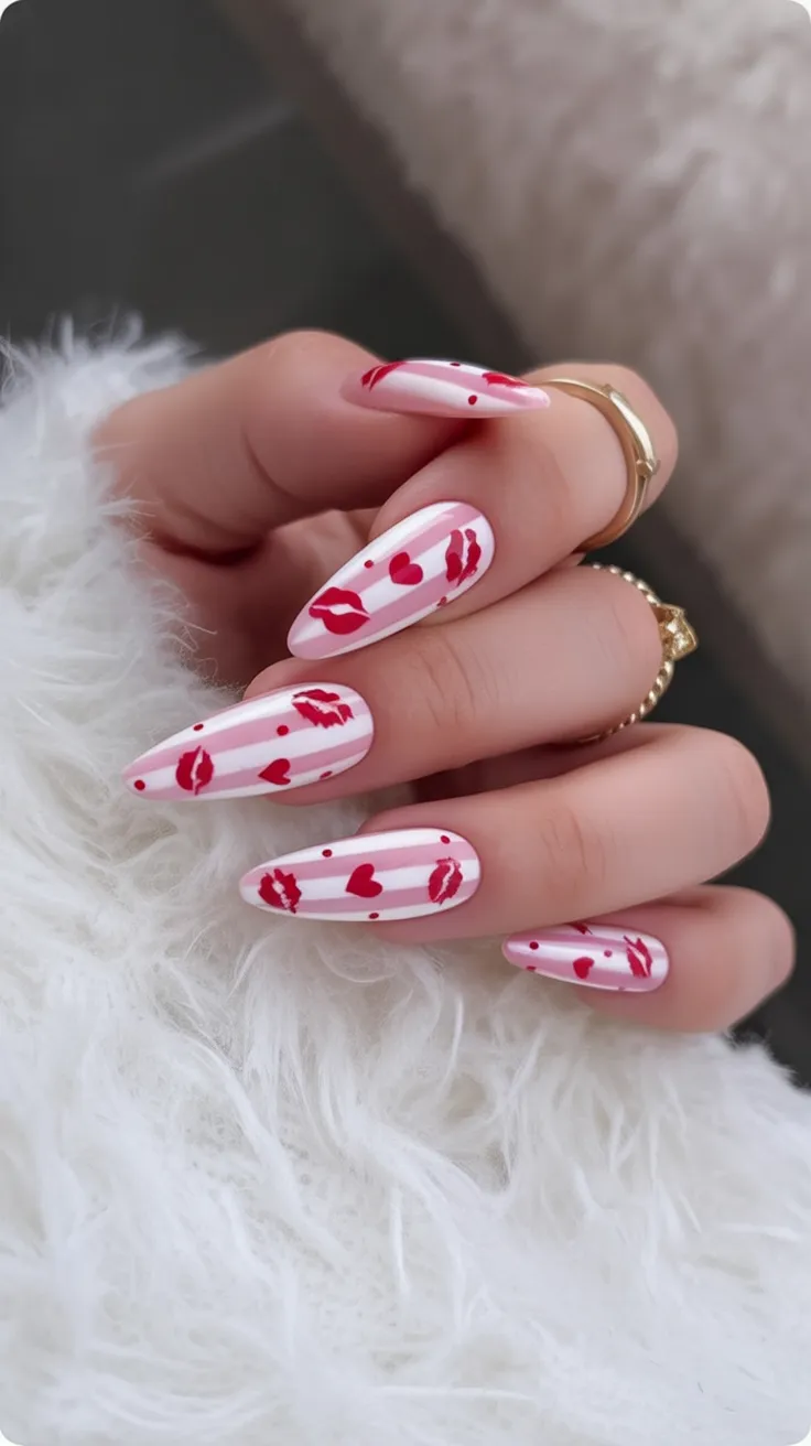 Now this one is pure personality. The soft white and blush base combined with tiny red hearts and playful lip prints feels bold, confident, and just a little cheeky. It’s the manicure equivalent of wearing your favorite red lipstick—bright, expressive, and impossible to ignore. Definitely a conversation starter.