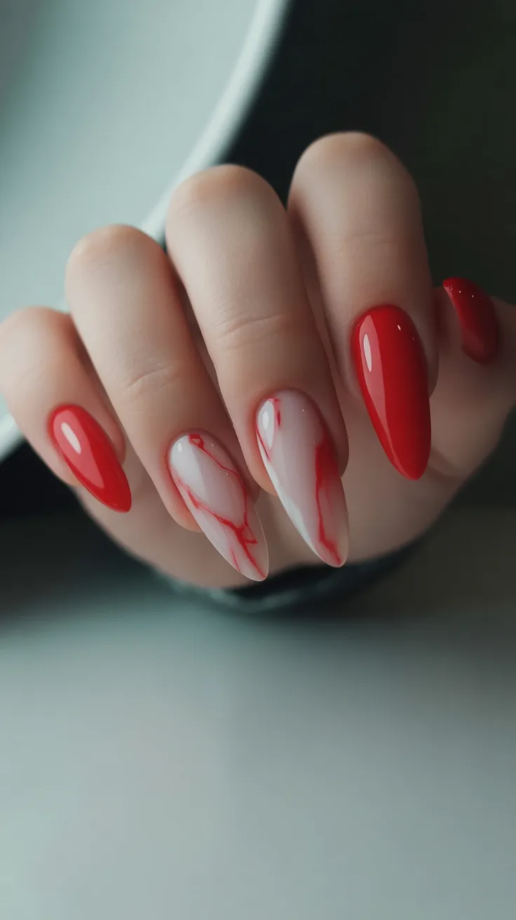 There’s something so modern about a soft nude base with delicate red marble-style streaks. It feels artistic, almost like abstract canvas art, while the solid bright red nails keep everything grounded and polished. This design has a quiet sophistication—understated but definitely not boring.