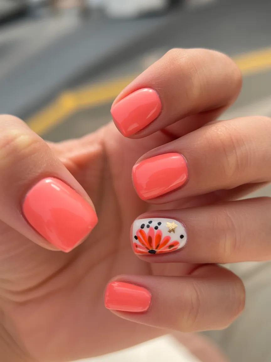 This is the kind of Bright coral that instantly energizes your whole look. Bold yet cheerful, it brings that Hot summer mood straight to your fingertips. The single accent nail with floral Art and tiny gold detail adds personality—like a wink that says you’re confident and not afraid of Color.