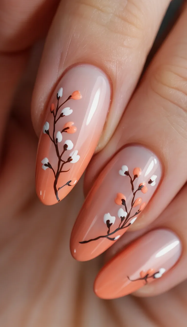 There’s something quietly romantic about this Soft gradient Peach look. The delicate branch Art feels almost hand-painted in a tiny gallery, with little white blossoms adding Light contrast against the warm base. It’s subtle, thoughtful, and beautifully balanced.