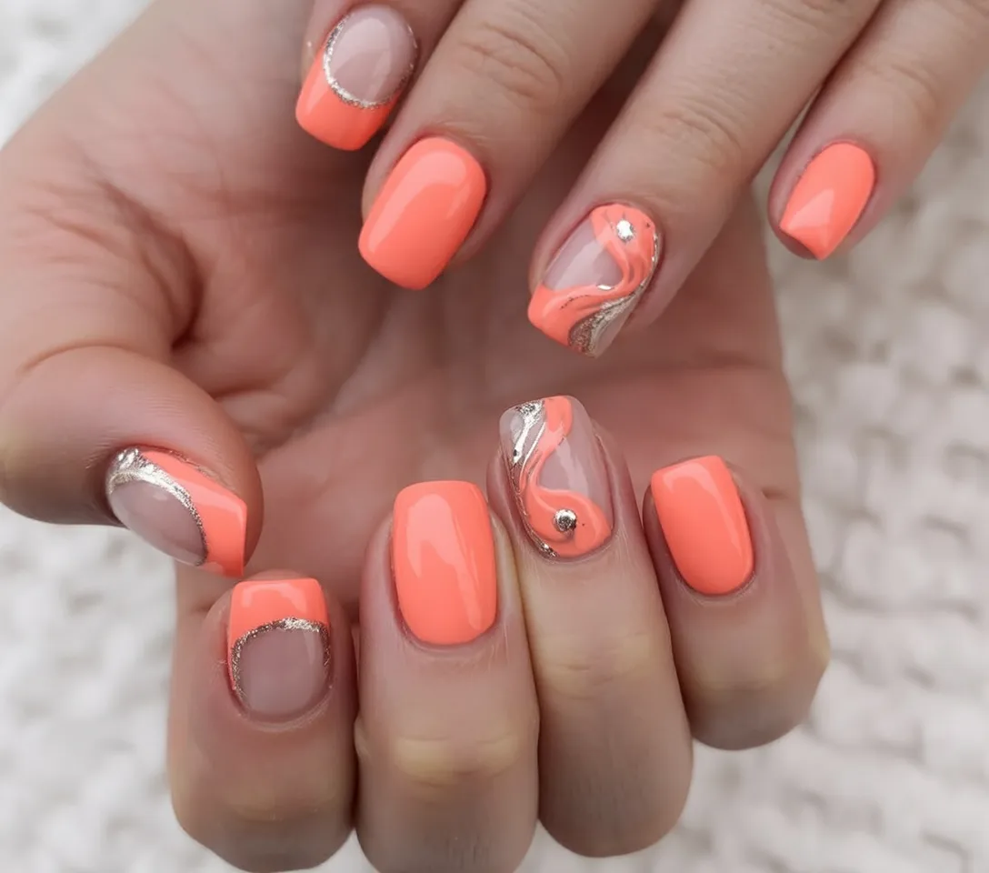 This Neon coral shade absolutely glows. It’s Hot, confident, and impossible to ignore in the best way. The soft nude accents framed with delicate silver waves and tiny crystals create a stunning contrast that feels both playful and polished. It’s bold but still beautifully balanced.