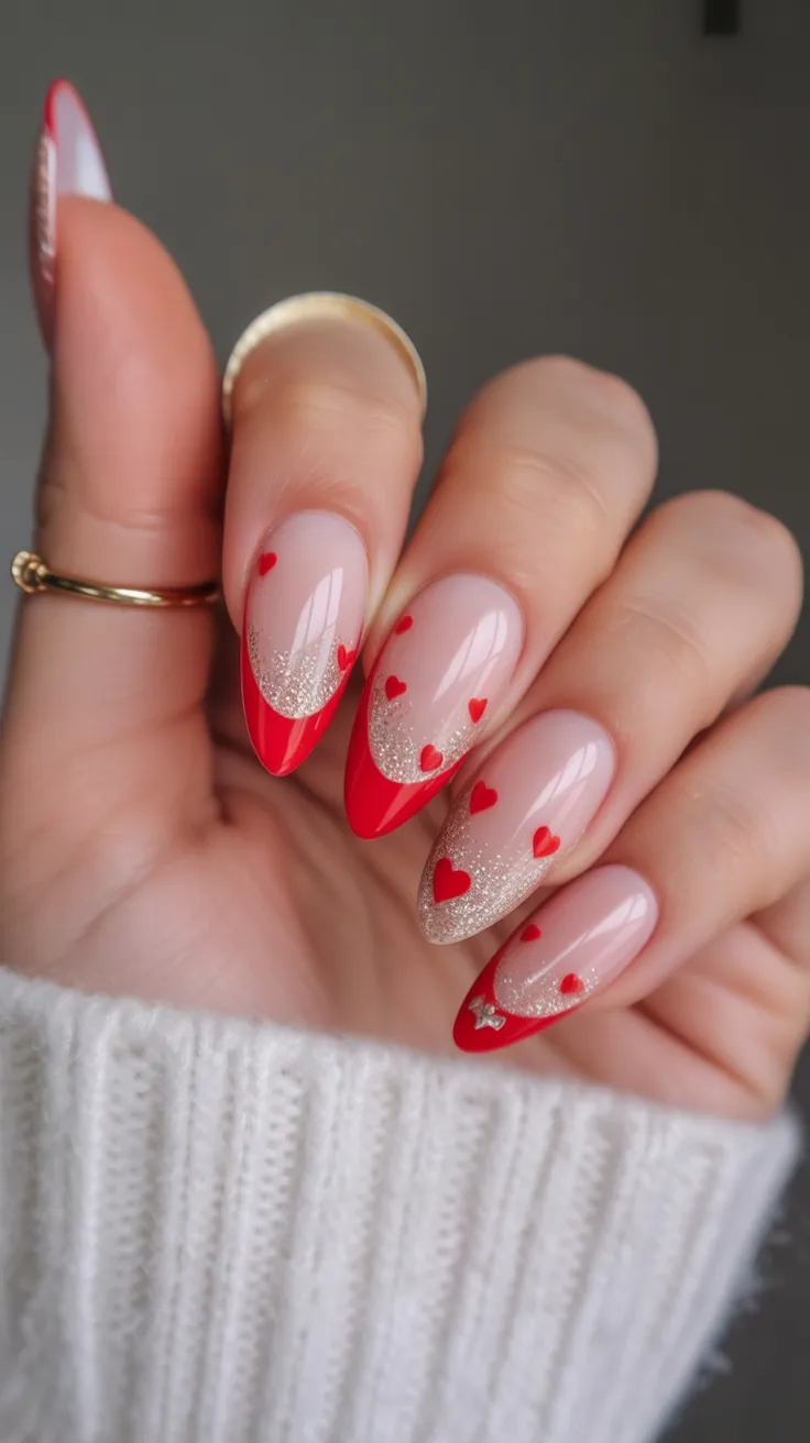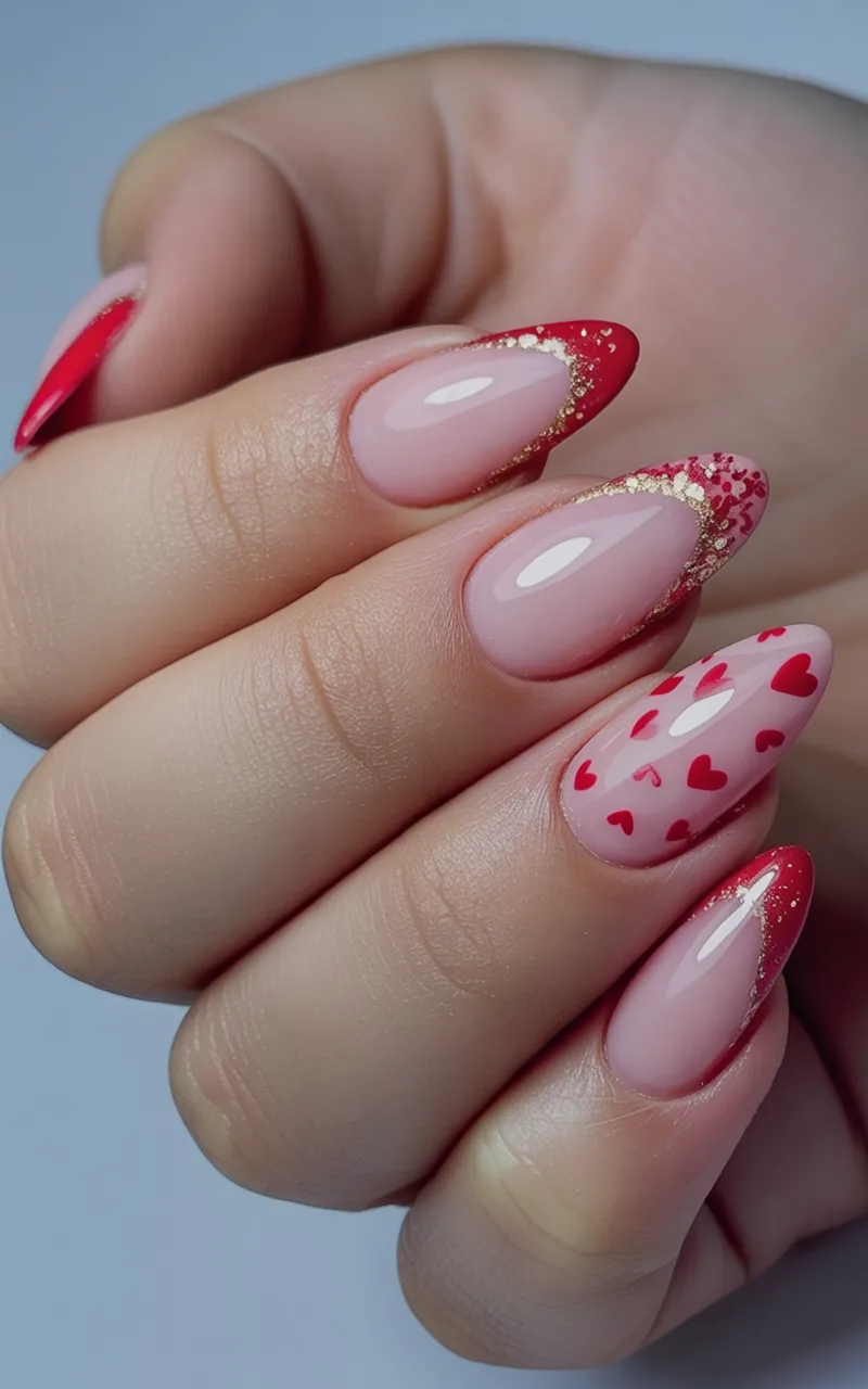 5. Soft Nude Almond with Red Hearts and Sparkle