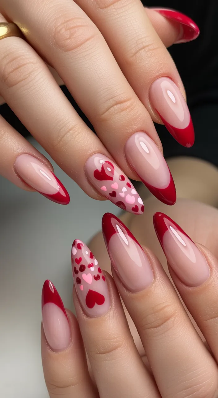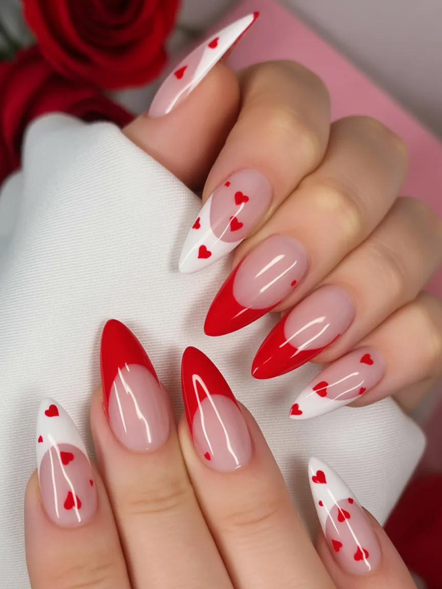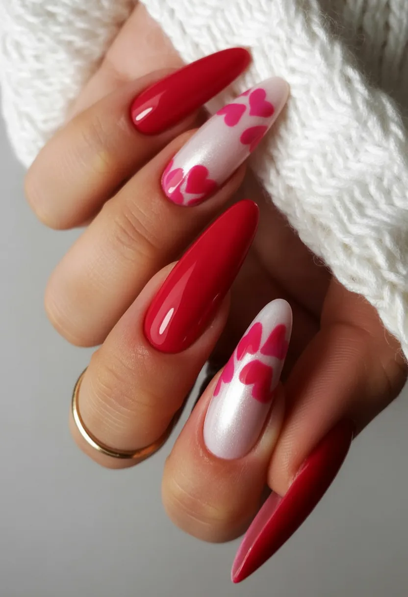 If you love a bold manicure that still feels romantic, this one is such a dream. The glossy Red almond nails bring that confident, classic energy, while the soft pearly accent nails with scattered Pink hearts add a sweet, feminine twist. It’s the perfect balance between strong and soft—dramatic but still undeniably beautiful.