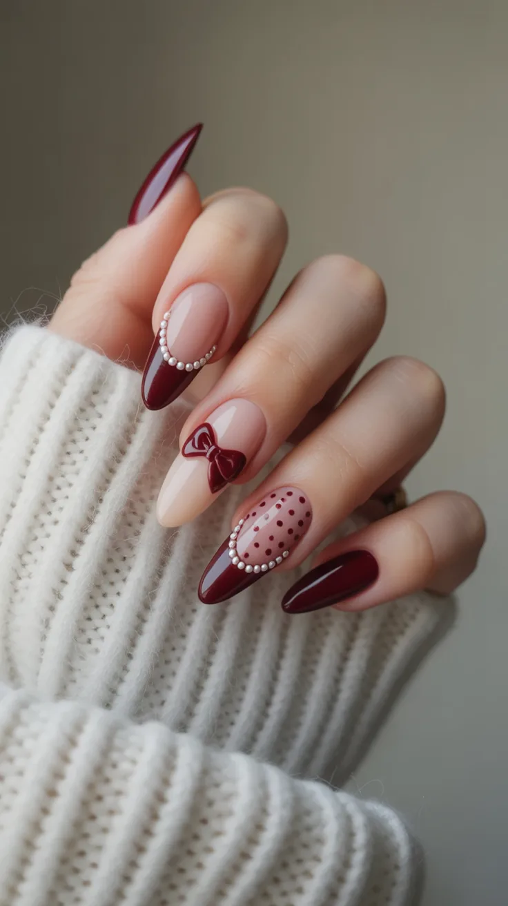 This is what I would call grown-woman glamour. The Dark burgundy color is luxurious and sophisticated and goes well with the nude base. The small pearls and dotted details give it a classy, almost couture feel. Yes, it is dramatic, but it is also very composed and beautiful.