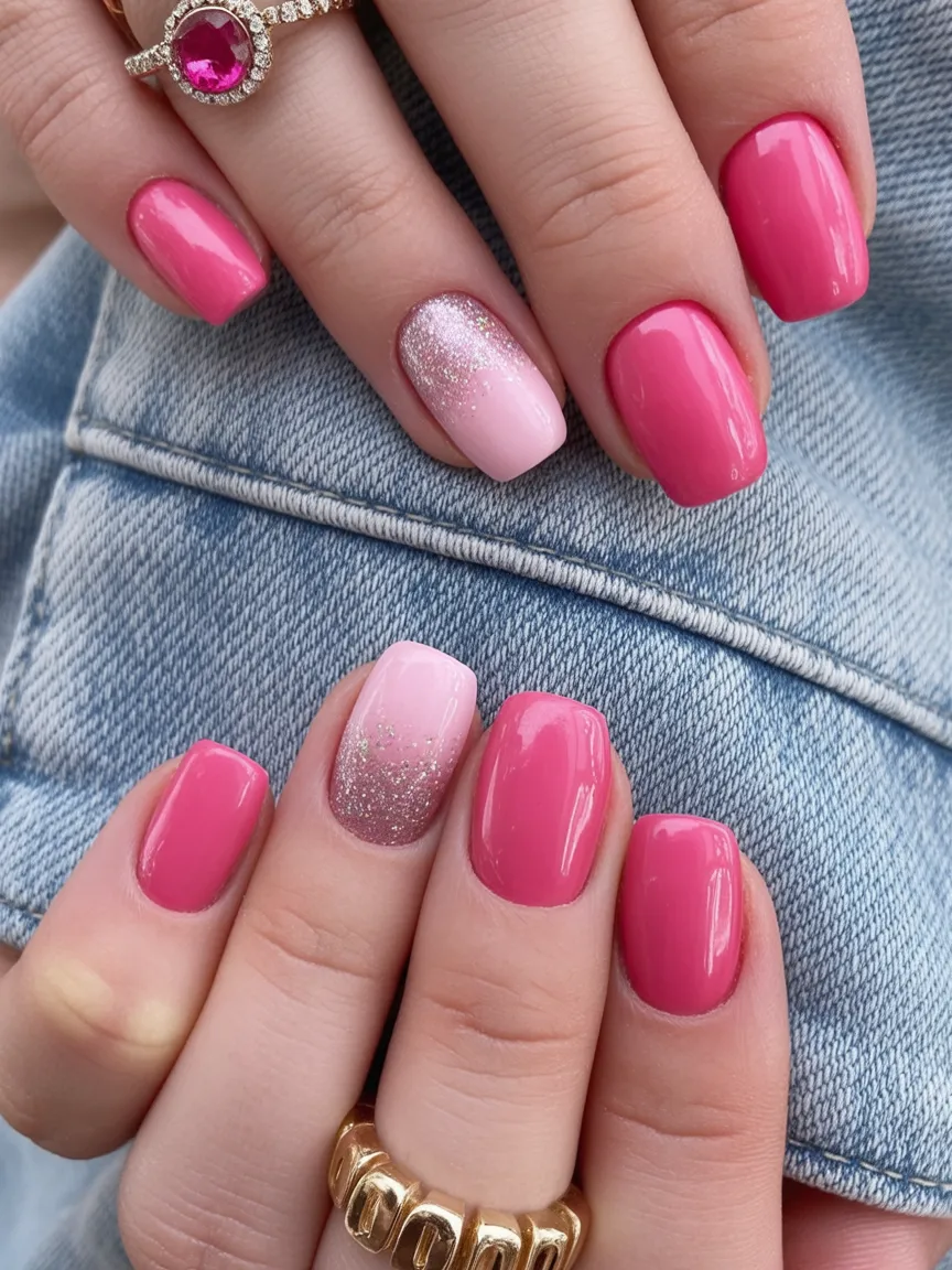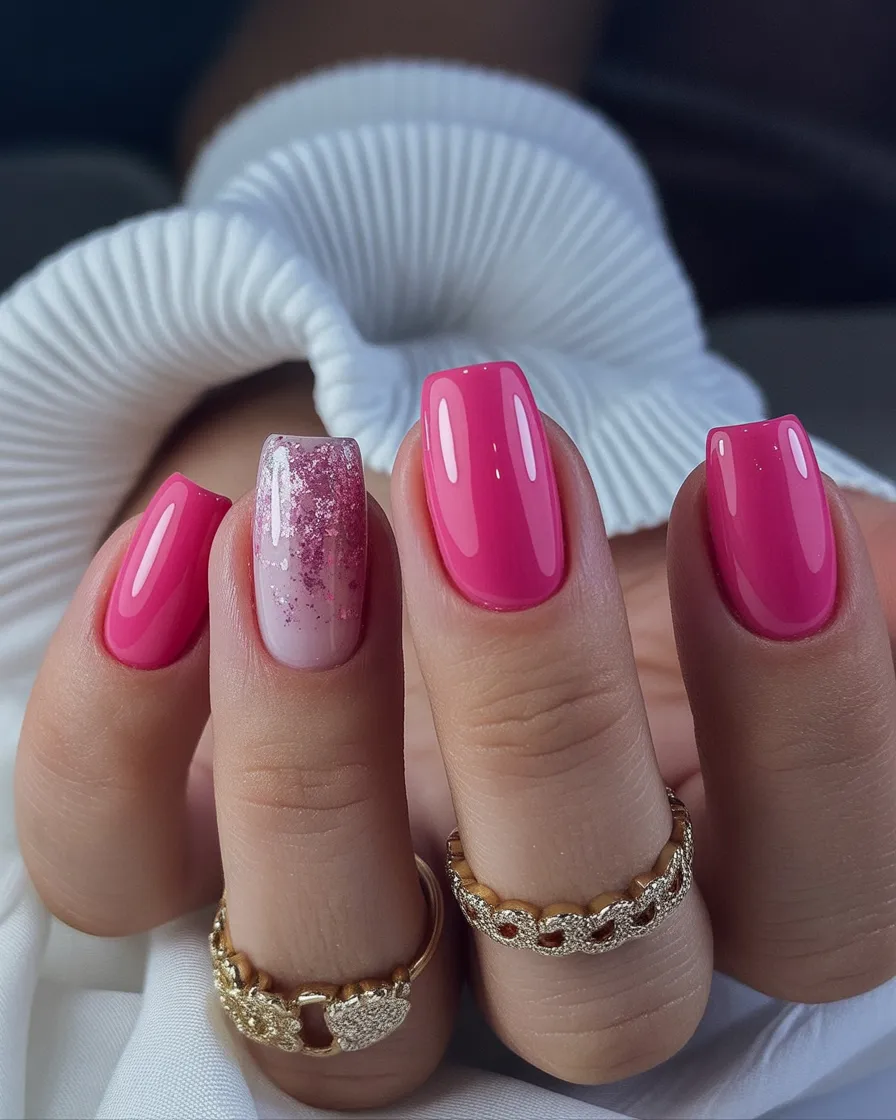 Other times, you want a tone that makes you feel alive, and this bright Pink set definitely does that. The soft glitter fade on the accent nail is a touch of Art that adds that playful thing to the set without overcrowding. It’s fresh, and honestly, a little addictive to look at.