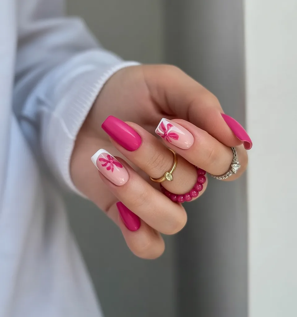 This manicure feels like a fresh bouquet in bloom. The soft blush base paired with vibrant Pink tips and delicate floral Art gives it a light, joyful personality. It’s feminine without being overly sweet—just the right mix of playful and polished. Honestly, it’s the kind of Inspo that makes you book your next salon appointment immediately.