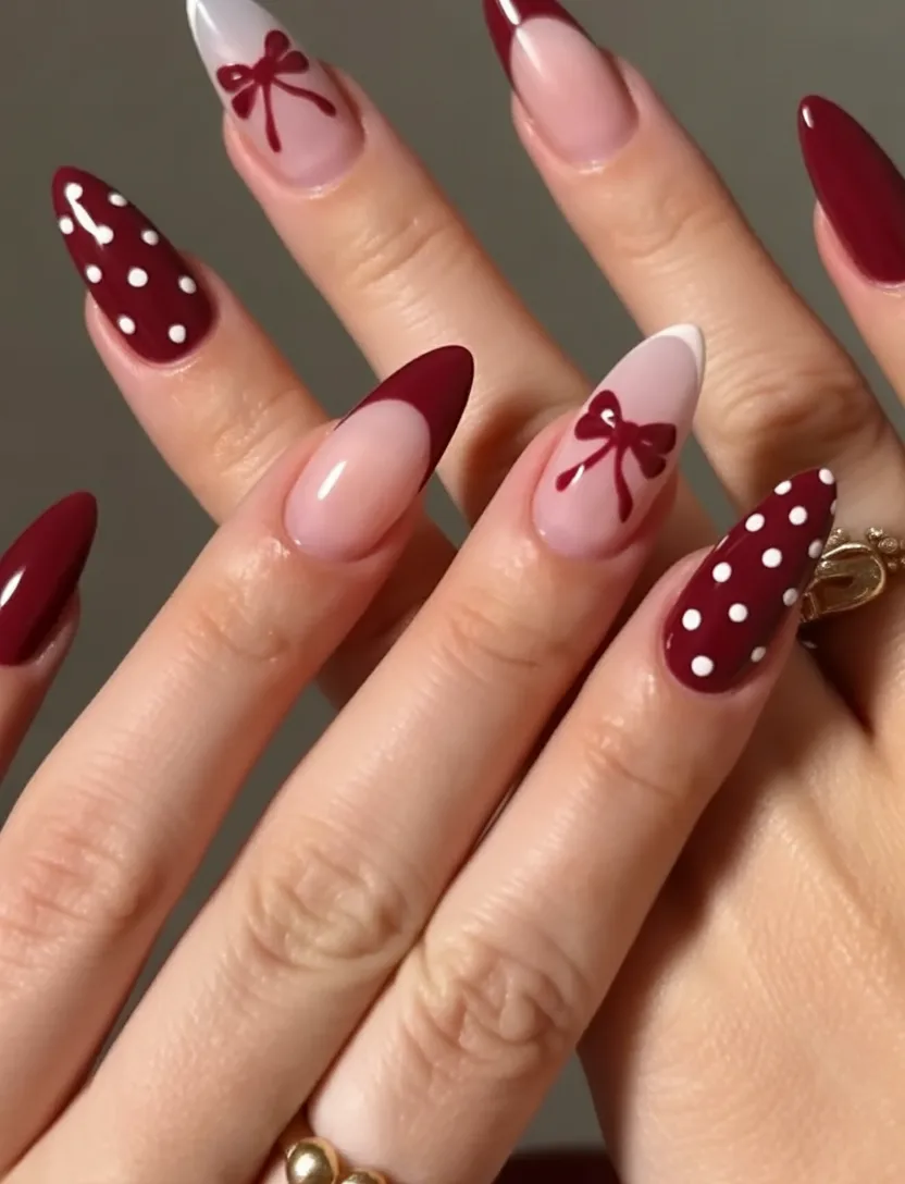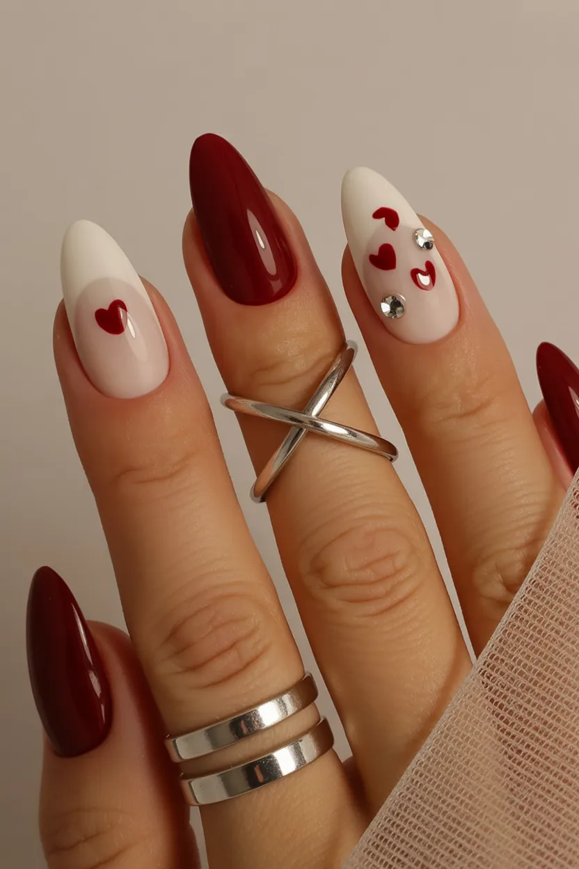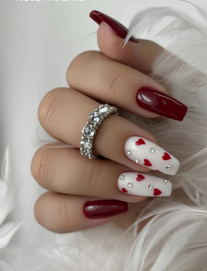 This one is pure drama in the best possible way. Deep Dark burgundy nails paired with crisp White accents and tiny crystal details feel luxurious and intentional. The little Red hearts soften the look just enough, creating a balance between bold and romantic. It’s classy, striking, and unapologetically feminine.