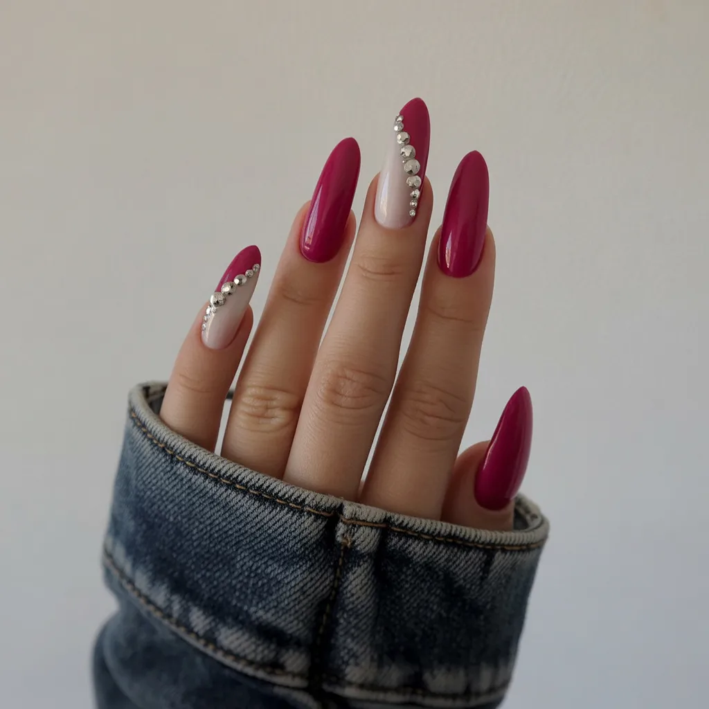 This deep-pink magenta is a bolder choice that feels confident and modern. The crystal curve detail is positioned perfectly to remain classy and minimal. It is just enough bling to remain elegant while catching the light to give you an overall polished look. The lengthening feature of the almond shape is ideal for this color. These designs will do great starting from medium to long nails. Classy looks using this color will be super trendy for 2025 with sculpted silhouettes and a focus on jewel tones. It is still a fully manageable design that is advanced from the typical minimalist style.