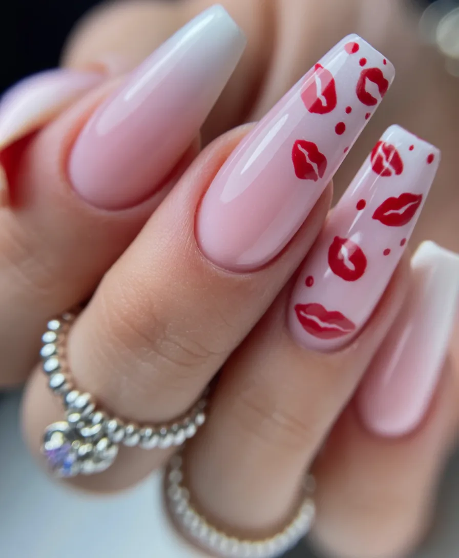 I think this design is playful and charming in the best way. The soft pink base is romantic, while the clean style of the design keeps things tidy. The bold red lip art looks great and adds charm and character to the design. It is a great touch of fun and soft glam as well as adorably expressive.