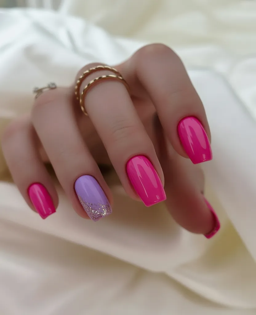 Bold Pink nails always make a statement, but the combination of this color and a soft lavender accent nail takes this design somewhere unexpected. The mini shimmer detail also adds some dimension that catches the light beautifully to avoid a flat look. The design is bright and confident and just a touch playful. The kind of manicure that is bound to boost your mood.