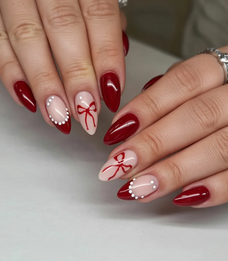 A striking, high-gloss Red manicure is very eye-catching. There is definitely a classy and elegant touch to Almond shaped nails, and in combination with the Red and Nude color contrast and the addition of a bow and some little pearls, it creates a very balanced and stunning design that is definitely in the category of wearable art.