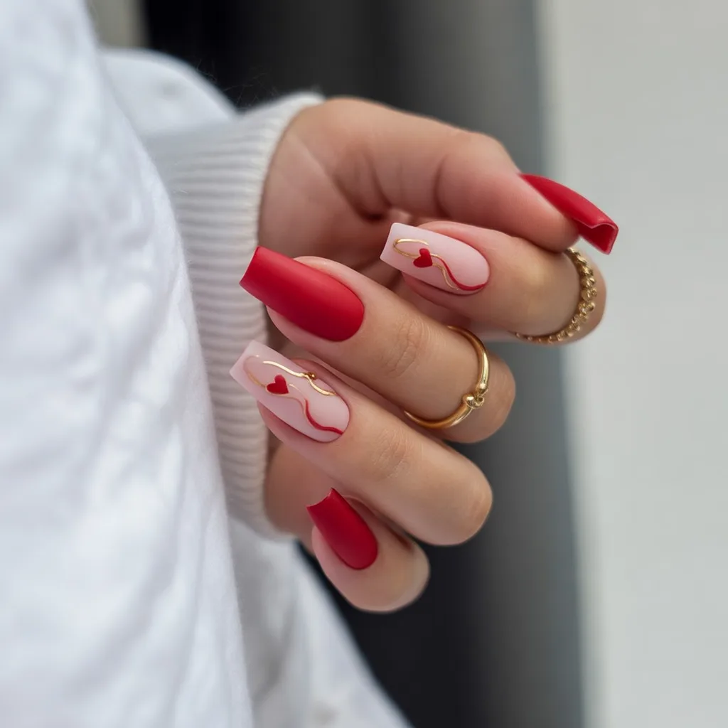 This manicure feels like a love letter written in polish. The soft blush base keeps everything Simple and Clean, while the bold Red tips bring that confident, feminine energy we never really outgrow. Tiny hearts and a whisper of Gold along the curve add just enough Art to make it special without looking busy. It’s romantic, a little flirty, and still completely classy.