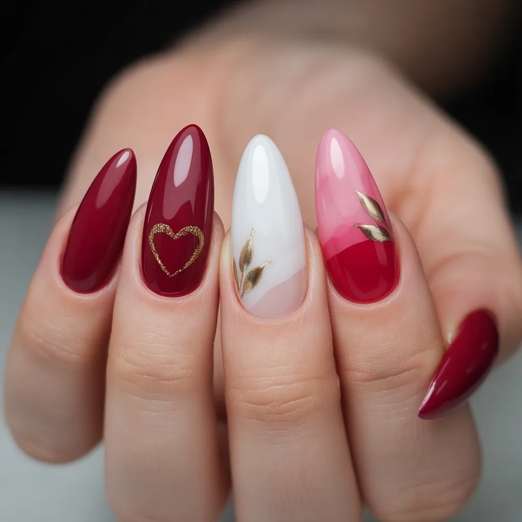 This manicure feels refined and grown-woman gorgeous. The deep Dark burgundy paired with soft blush and crisp White creates a layered, sophisticated palette. The subtle Gold leaf detailing and tiny heart accent elevate the entire look, turning it into wearable Art that feels luxurious yet tasteful.