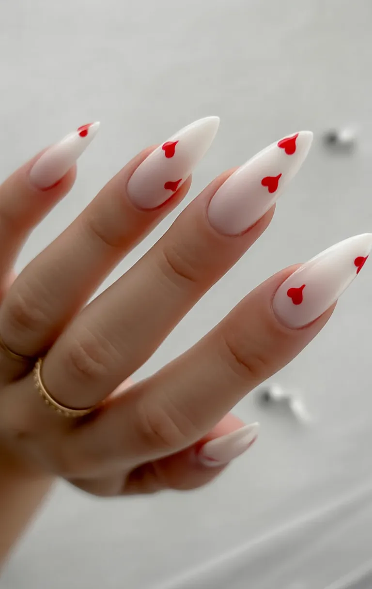 Sometimes less really is more. This Clean White almond manicure with tiny Red hearts scattered across the nails feels fresh, Simple, and quietly beautiful. There’s no heavy detailing, no glitter overload—just crisp color and sweet little accents that speak for themselves.