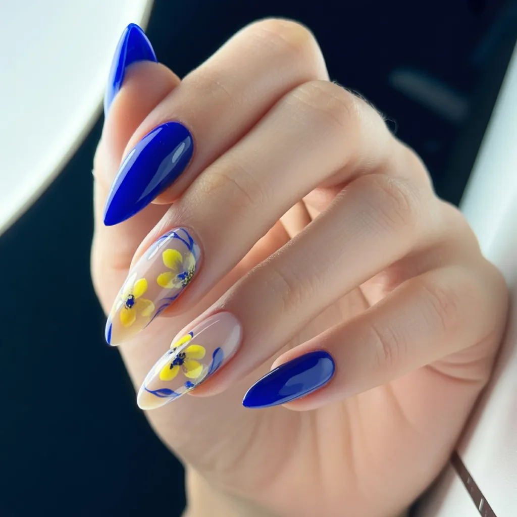 Confidence is probably the best word to describe this. The bright, attention-grabbing Blue polish is easily the star of the show, and the clear accent nails with Yellow floral design really make it even more impressive. It is modern, artistic, and very slightly edgy. It’s as if you are trying to make a statement by being colorful and using bright colors.