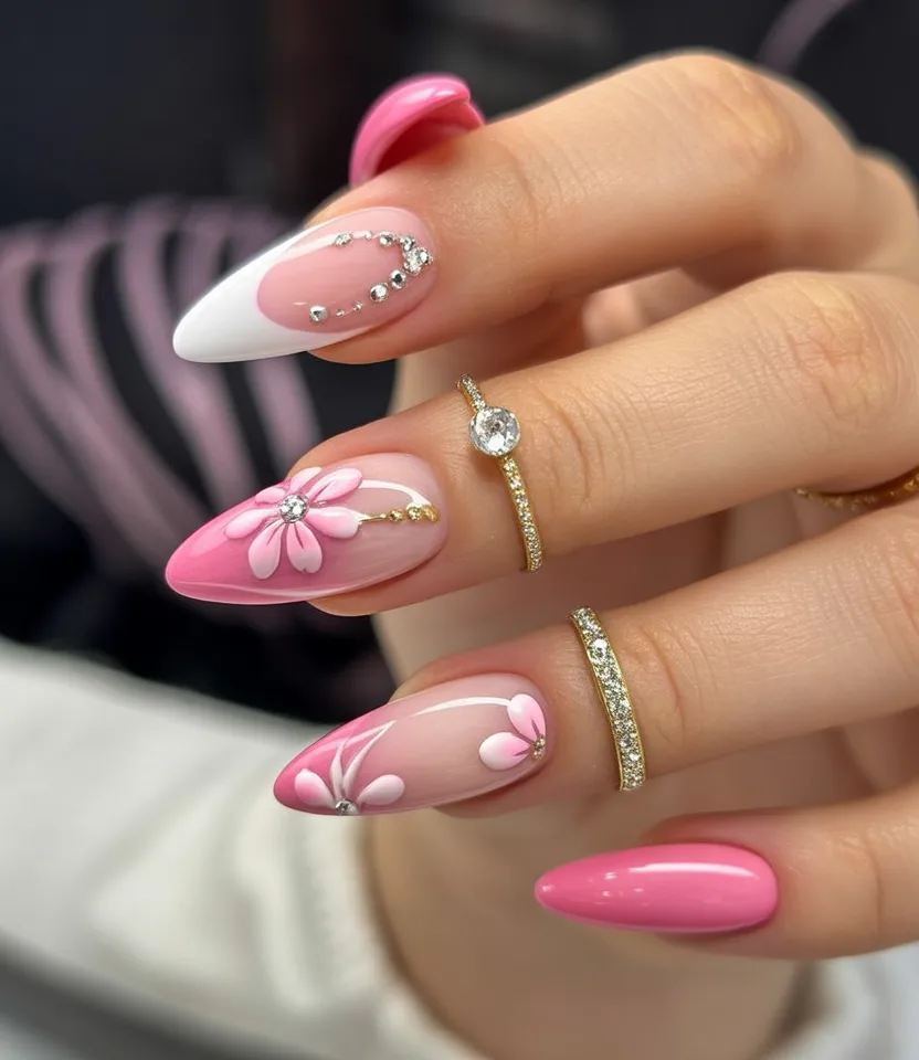 6. Pink and White Floral Accent with Rhinestone Design
