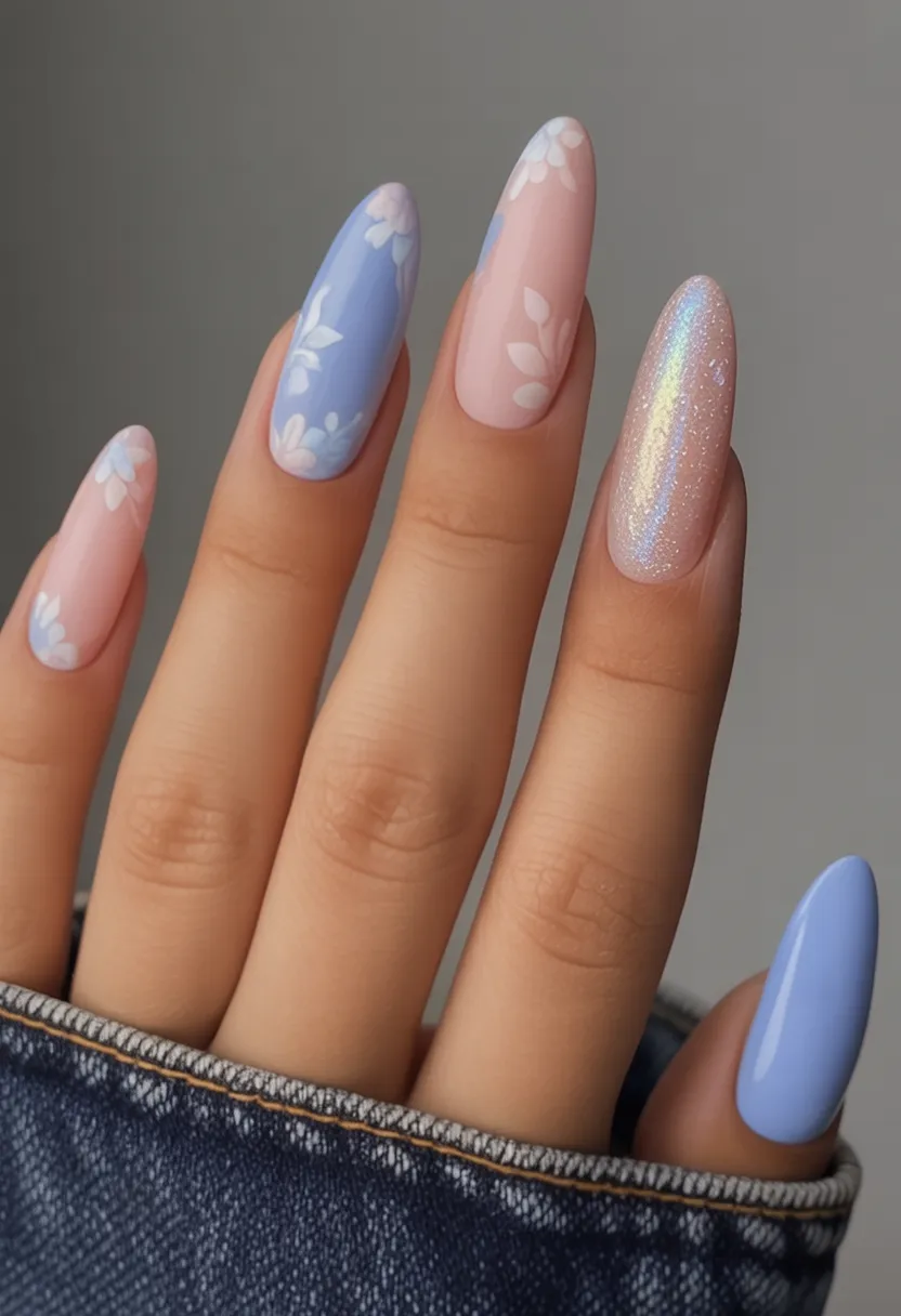 This combination of soft Blue and blush Pink feels like cotton candy skies at sunset. The delicate white floral Art layered over creamy Pastel tones gives the whole manicure a romantic, almost watercolor effect. And that subtle shimmer accent nail? It adds just enough glow to catch the light without overpowering the softness. It’s gentle, feminine, and quietly captivating.