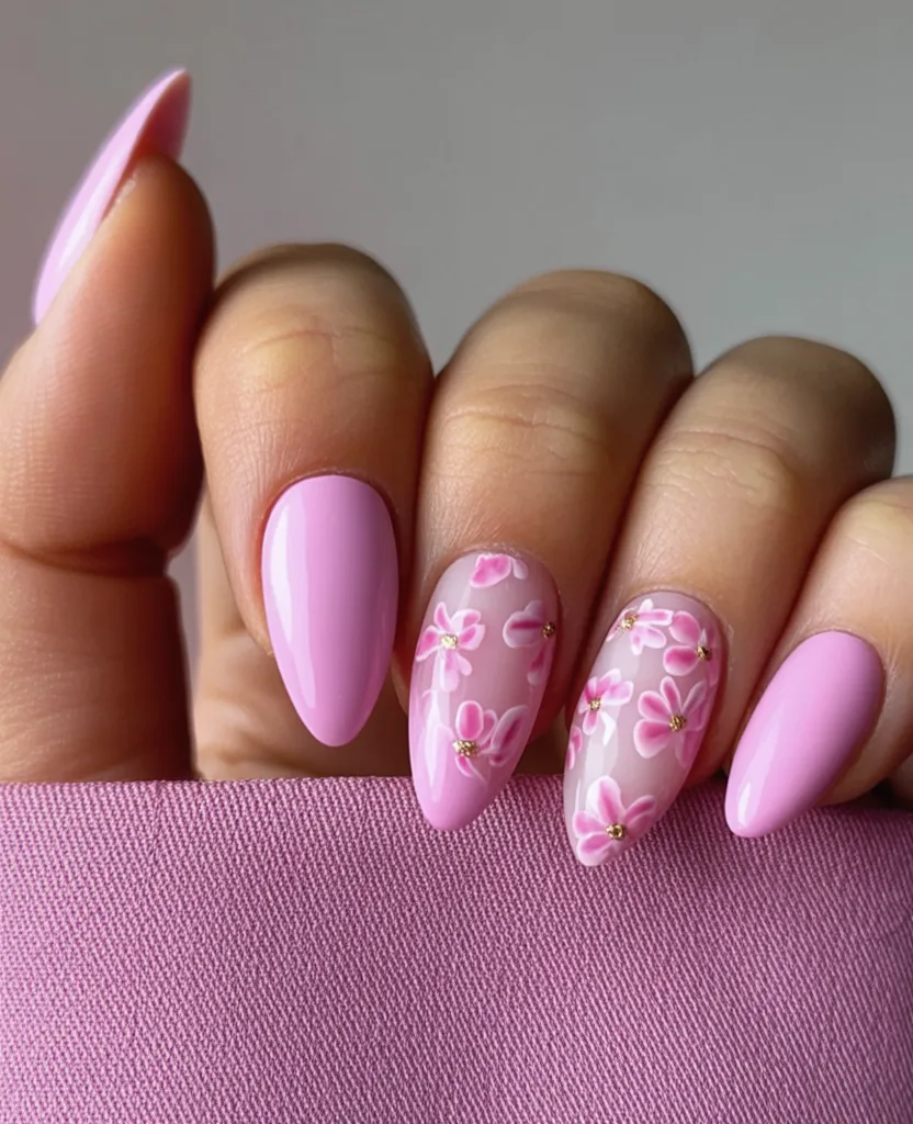 There’s something striking about a bold pink manicure in spring, with glossy solid pink nails. The spring floral nail art on the accent nails adds that little bit to make the whole design appear fresh. It creates a beautiful combination of bold and soft—like wearing your favorite lipstick with a floaty dress.