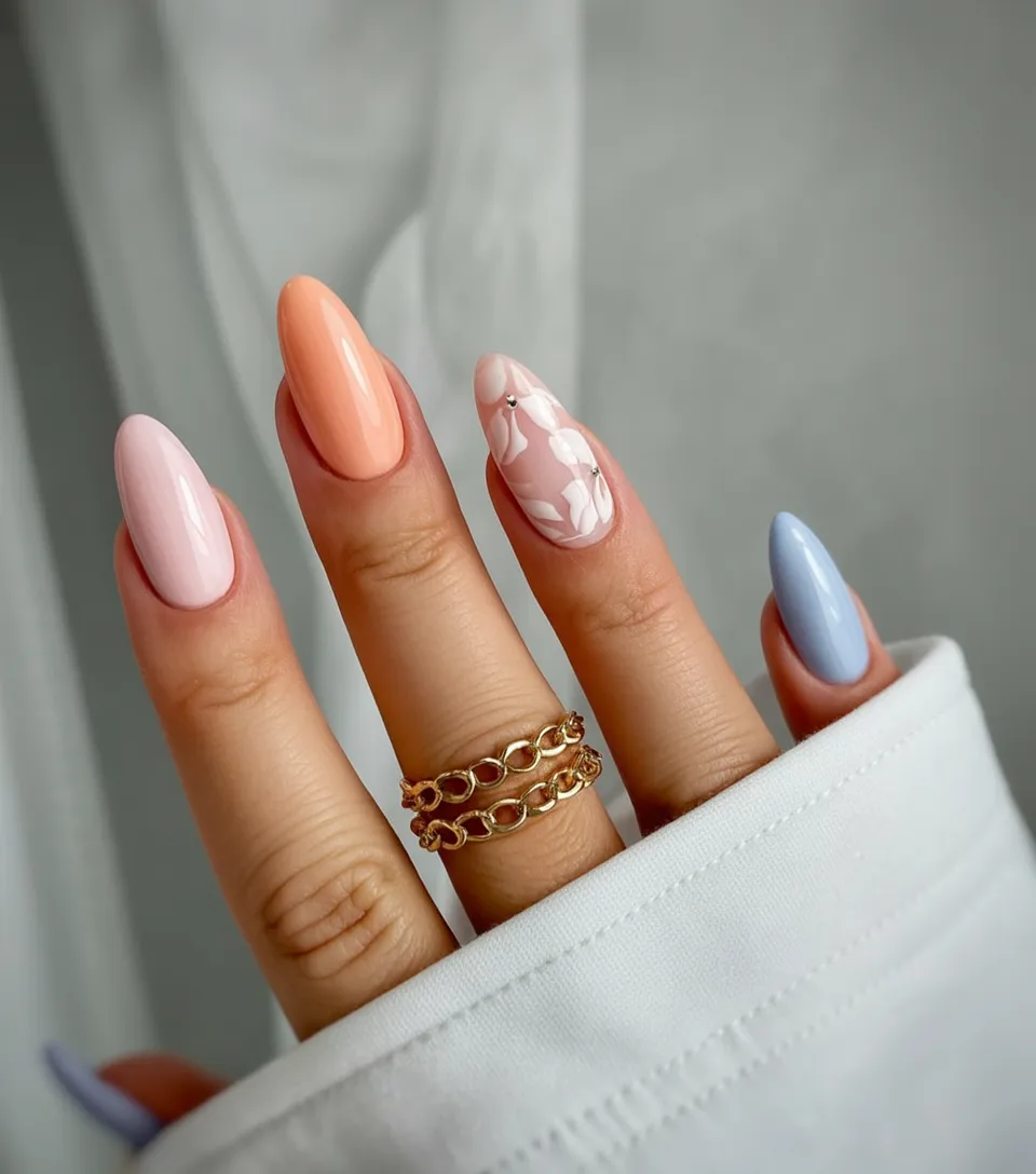 This is a beautiful option if you enjoy Simple Ideas with a twist. The Almond shape elongates the fingers, and the glossy finish keeps everything looking polished. It’s especially flattering on medium to Long lengths and works wonderfully if you want spring color without loud contrast.