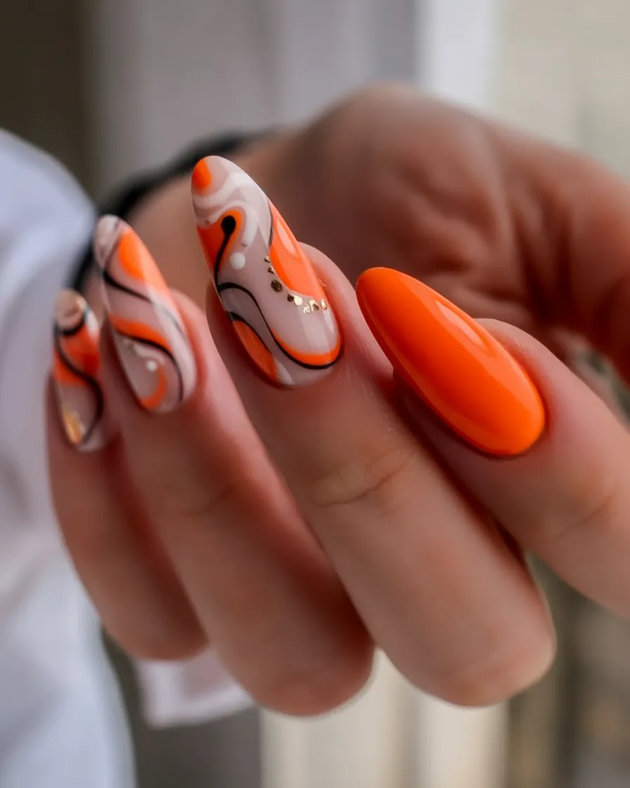 Bright Orange is a color that will definitely get you noticed, and to be honest, why would you want to be anything else? The swirling Art that has been layered over a nude base gives a lot of movement and goes towards the more dramatic side of things, almost like it is an abstract painting. The thick gloss Orange nails next to it are a great way to set the look and make it feel intentional rather than busy. It is bold, modern, and super Fun.