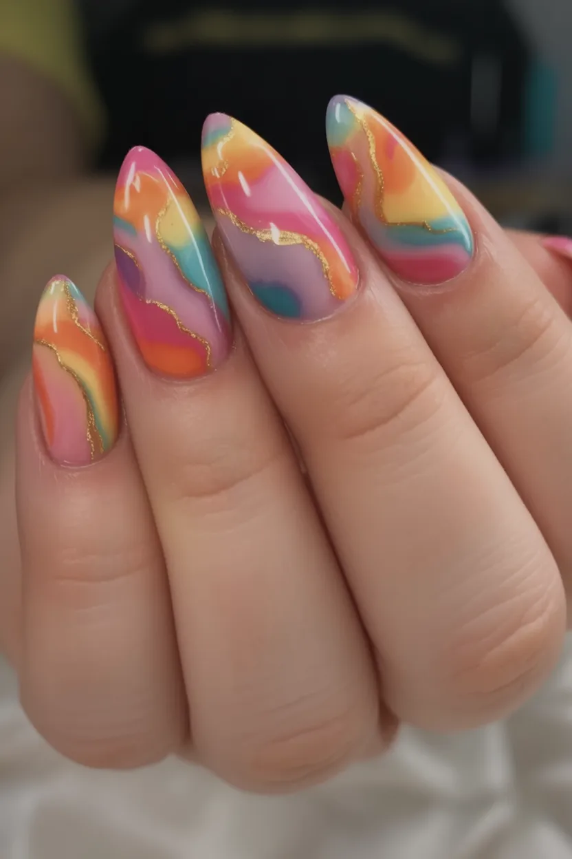 This look is ideal for those unafraid of the bold and the brilliant. The almond-shaped nails accentuate the fluid marble design, and the glossy gel keeps the colors vivid. It is the ideal design for women seeking fun, attention-grabbing designs while keeping it classy.