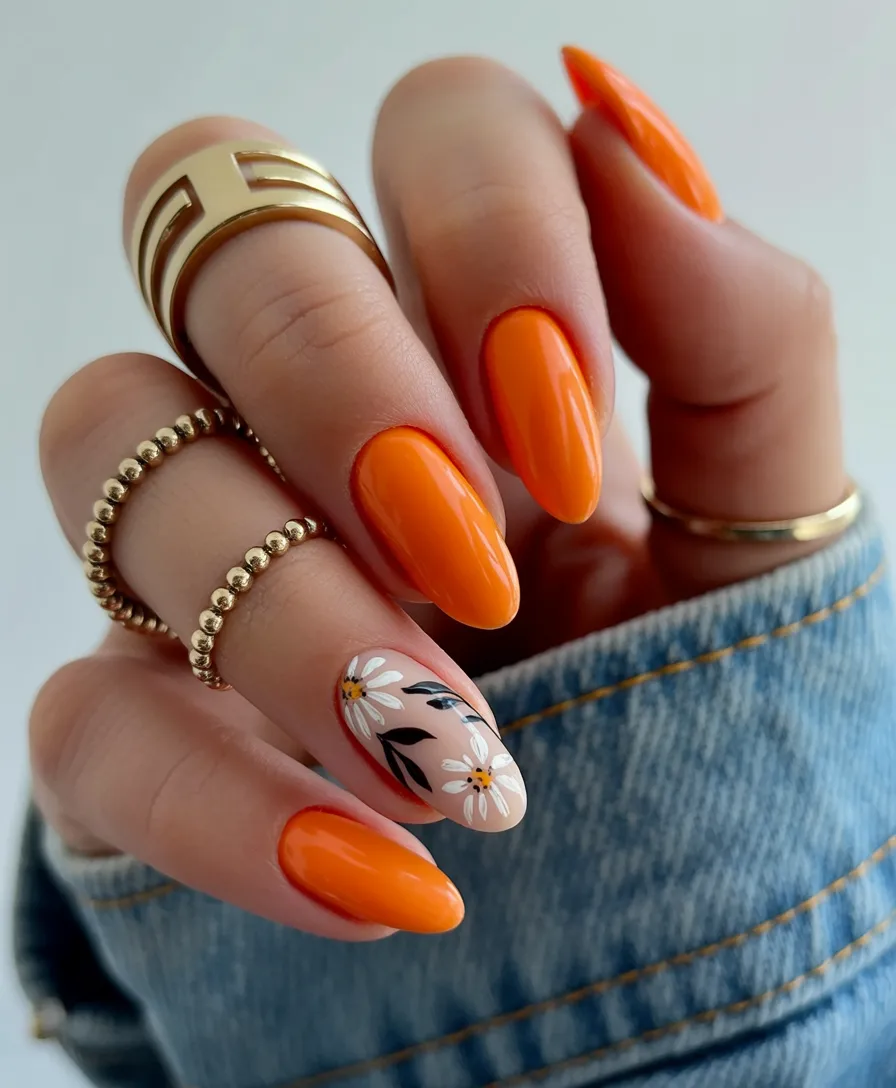 Bright orange is the color of pure sunshine, and this manicure is no exception. The glossy orange nails are bold and high energy, while the single floral accent nail softens the look The color is lively, warm, and bursting with personality, the kind of color that boosts your energy in an instant.