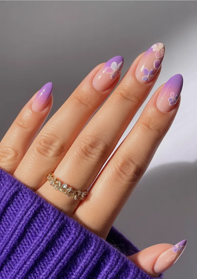 This soft lavender fade feels like the very first warm afternoon in March when you finally put the heavy coat away. The Almond shape adds elegance, while the gentle Pastel ombré melts into delicate floral Art that looks hand-painted with care. It’s romantic without being overly sweet, polished but still full of personality. These are the kind of spring Designs that make you want to gesture a little more just to show them off.