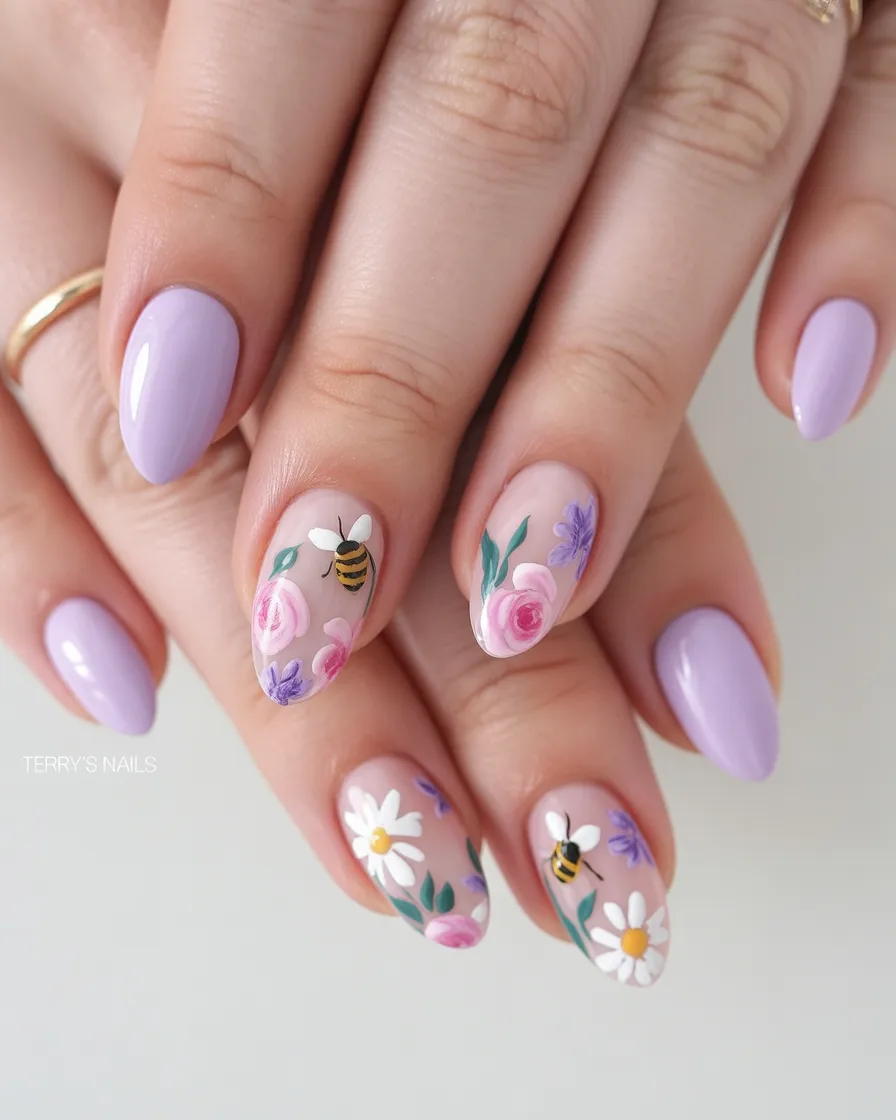 Isn’t this little garden so cute? The smooth lavender cut and white flower pattern nails, with tiny bee designs, look a little whimsical and even chic. It’s polite and calm, even like a ringing spring morning with fresh flowers on the table. It also feels like a nostalgic design. It is hoped that there will be fresh flowers during spring.