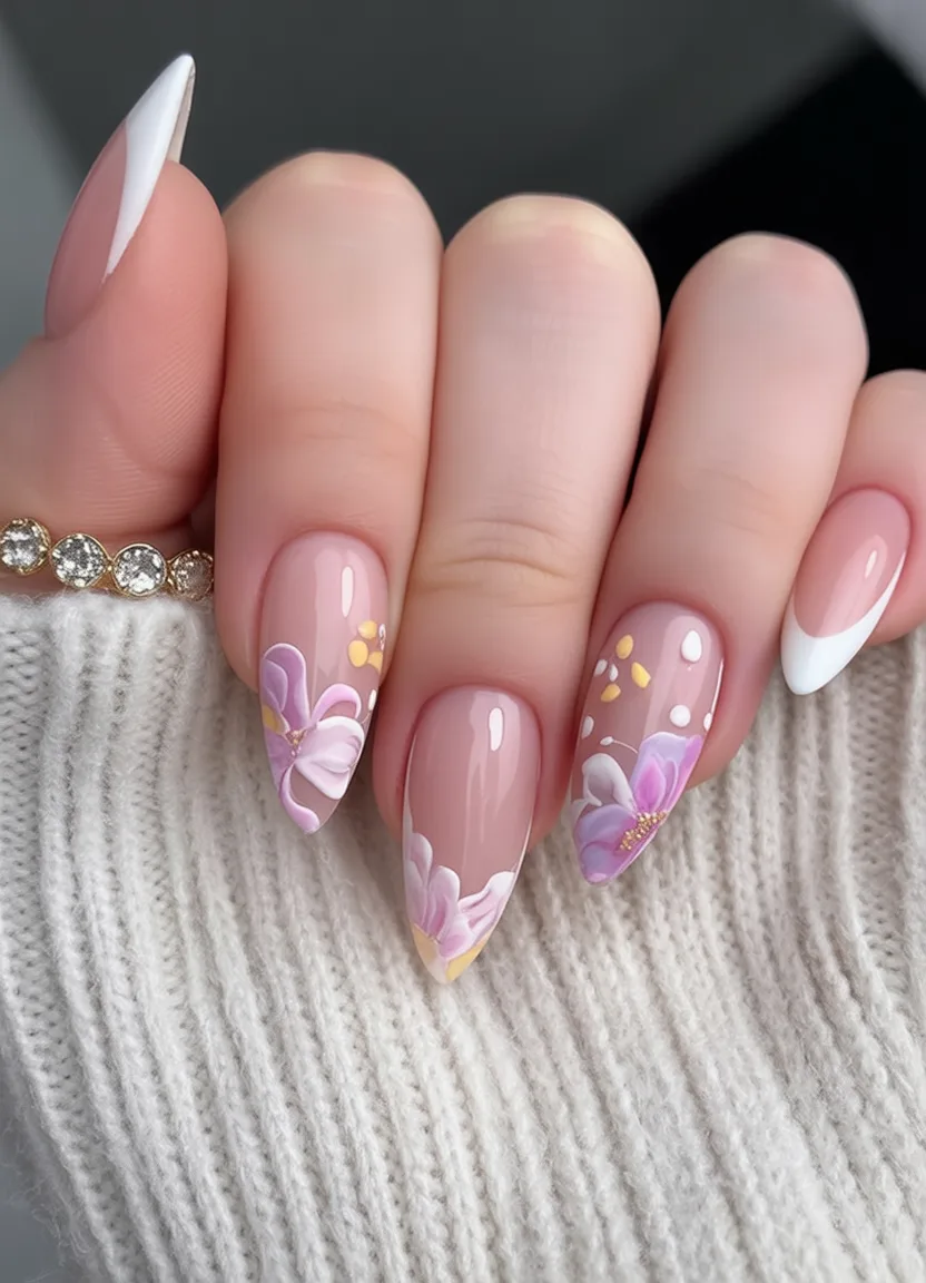 This manicure is like the feeling of wrapping yourself in your coziest sweater while spring is softly blooming outside. The soft blush background with clean white French tips is a classic look, and the pretty lavender floral accents create a soft romantic vibe. The tiny yellow details and dotted designs offer a little personality without cranking down the chic. Overall, it is refined, beautiful, and just the right amount of everything.