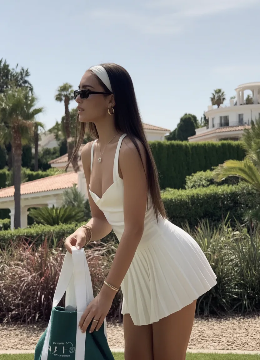 This look has that polished, sunlit elegance that feels straight out of a summer afternoon in the South of France. The structured top paired with the pleated skirt creates a silhouette that’s both feminine and strong. It’s giving Classy with a sporty twist—the kind of outfit that makes you feel instantly pulled together the moment you slip it on.