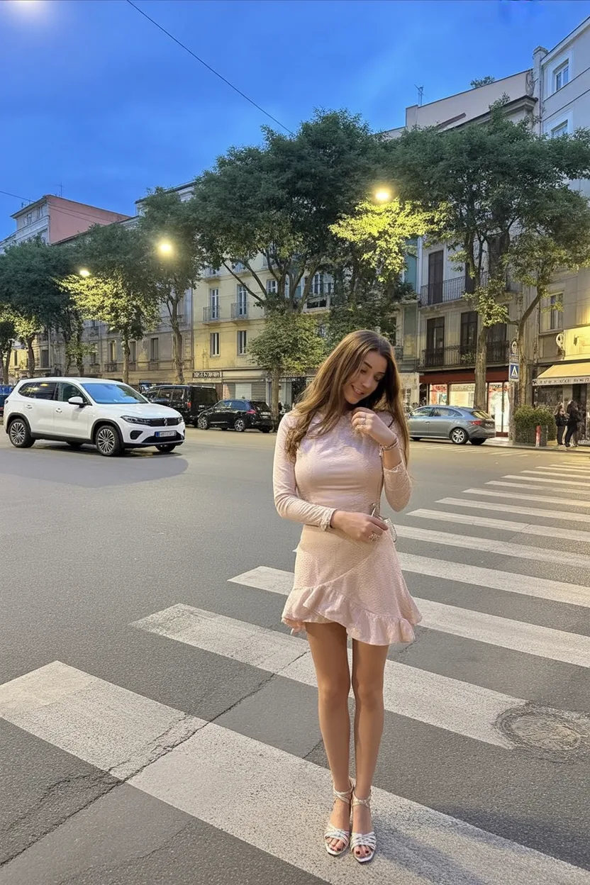 This look feels like one of those slow summer evenings when the air is warm and everything just glows a little softer. The delicate pink shade paired with the flirty hemline gives it that romantic, almost dreamy energy. It’s effortlessly Cute, with just enough movement to make you feel light on your feet—like you could wander the city for hours and still feel fresh.